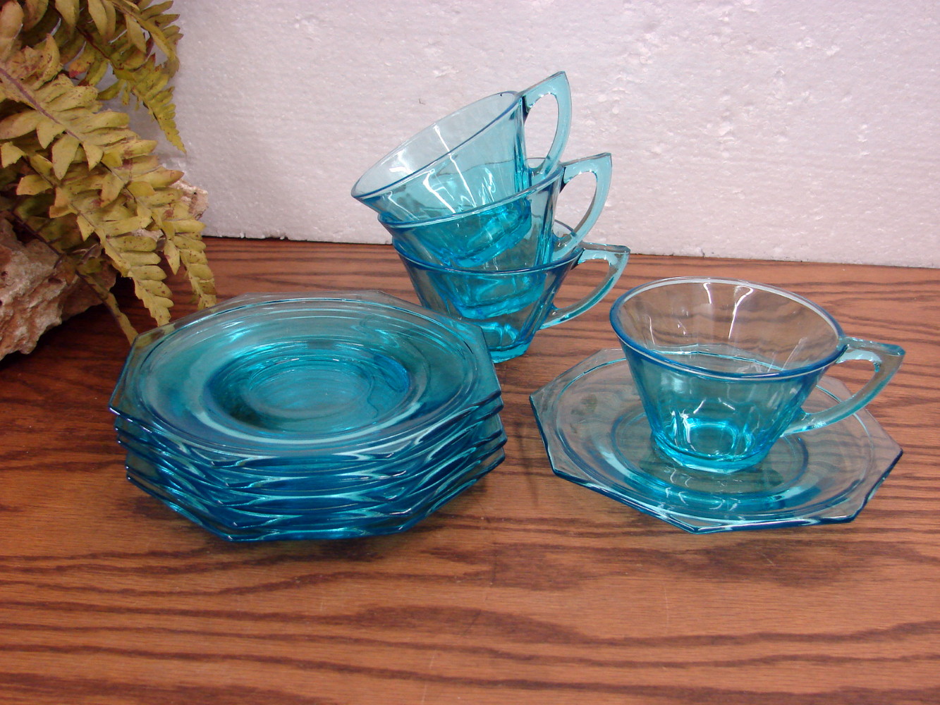 Gorgeous vintage Hazel Atlas Capri Octagonal Blue Aqua Cups and Saucers. Includes 4 Cups and 6 Saucers.  Sharp mold.  Free from damage.  Many other options in this pattern also available.