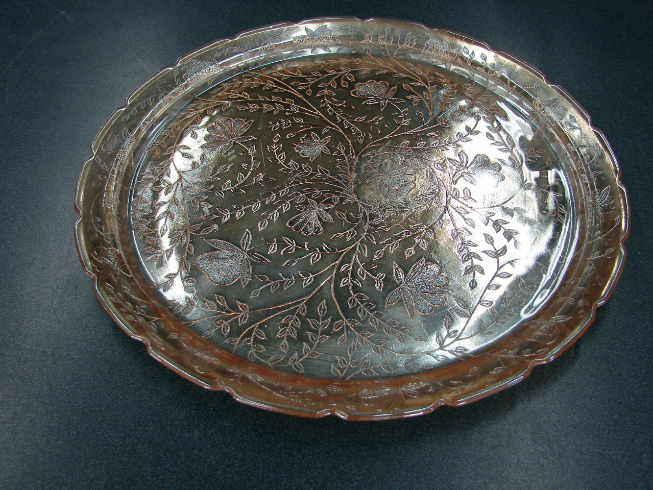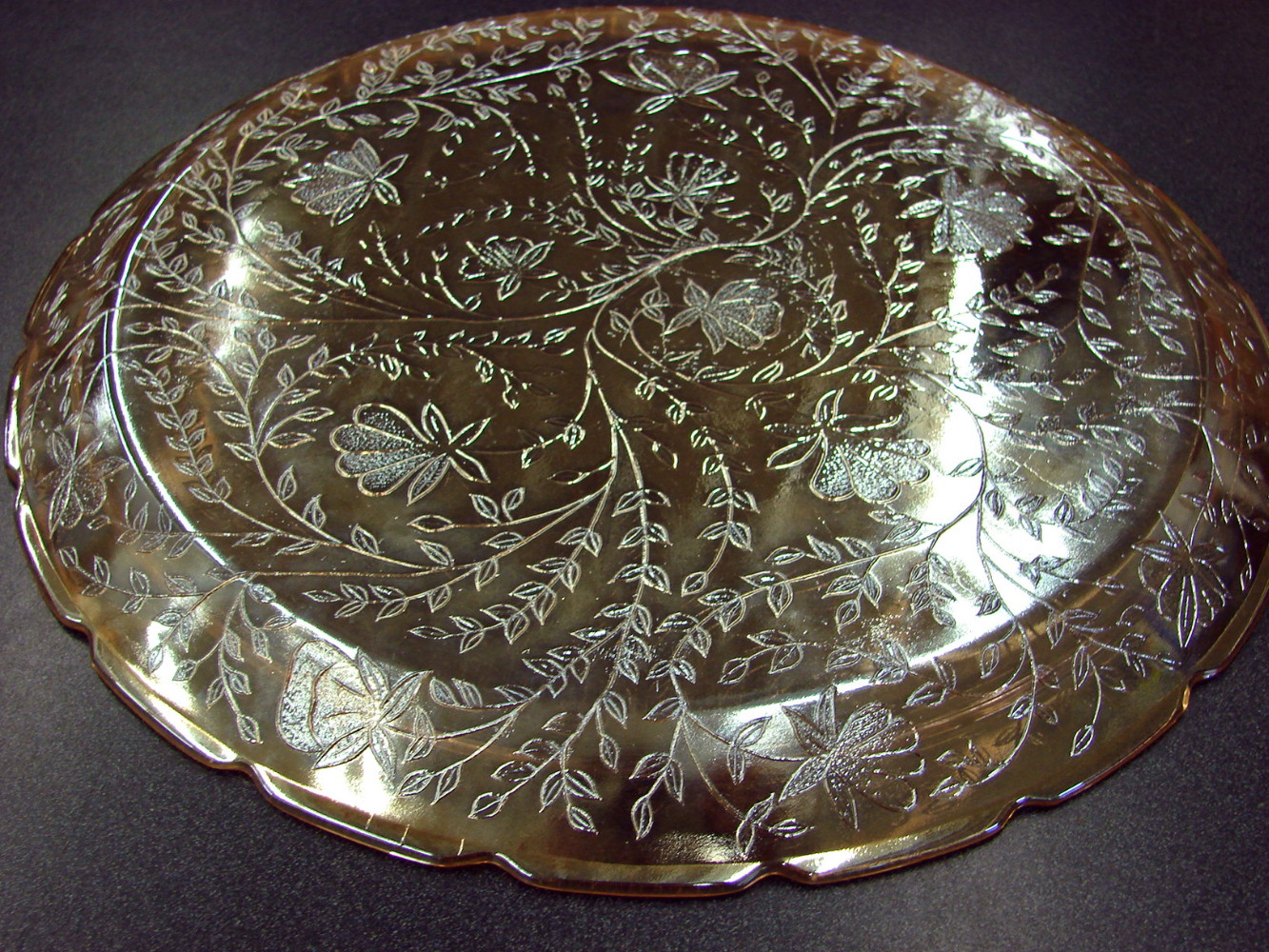 Vintage Jeanette Glass Iridescent Marigold Carnival Glass Peach Luster Louisa Platter. Measures about 13 1/2″ wide and is free from damage.