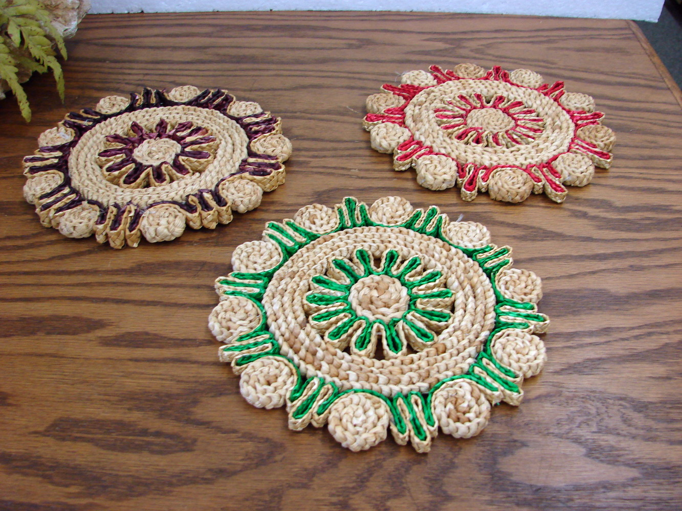 Vintage woven raffia straw trivet or hot pads. Set of 3. Measures about 7″. Free from damage.