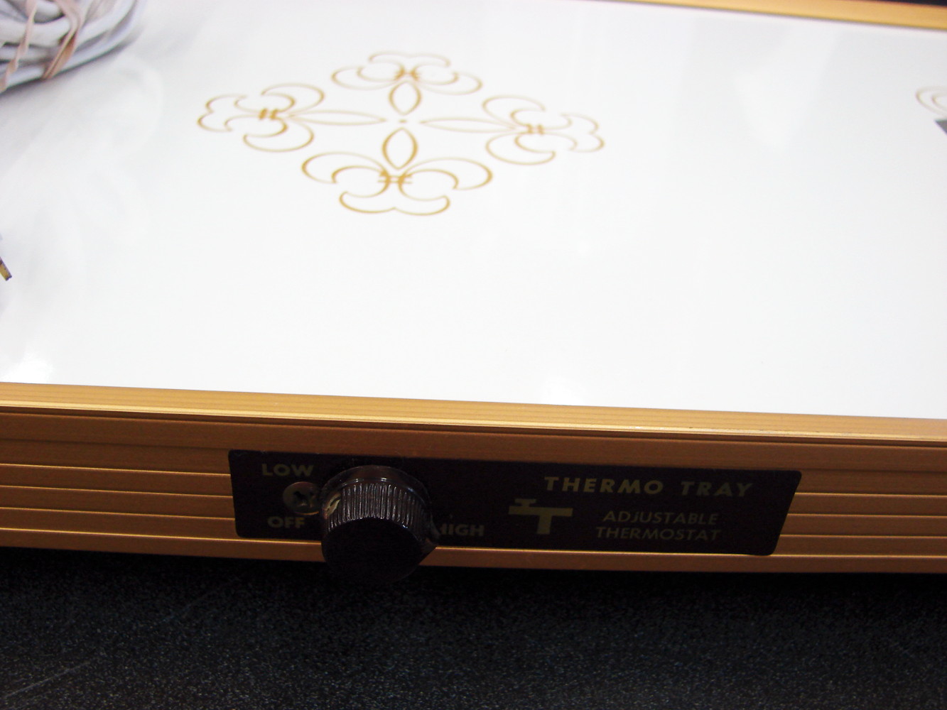 Vintage MCM Electric Hostess Warming Trays are perfect for Holidays, Buffets or simply big long family dinners on a Sunday. This one is a gorgeous embossed Harvest Gold Fleur De Lis pattern hot plate with a special Hot Spot and adjustment dial. Measures about 24 x 10″. Free from damage. Many other styles and options also available.
