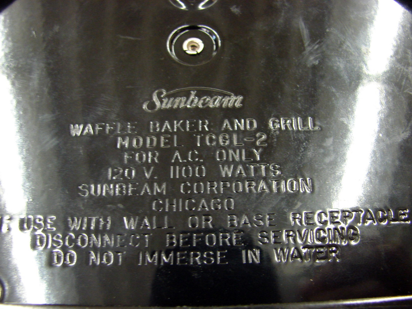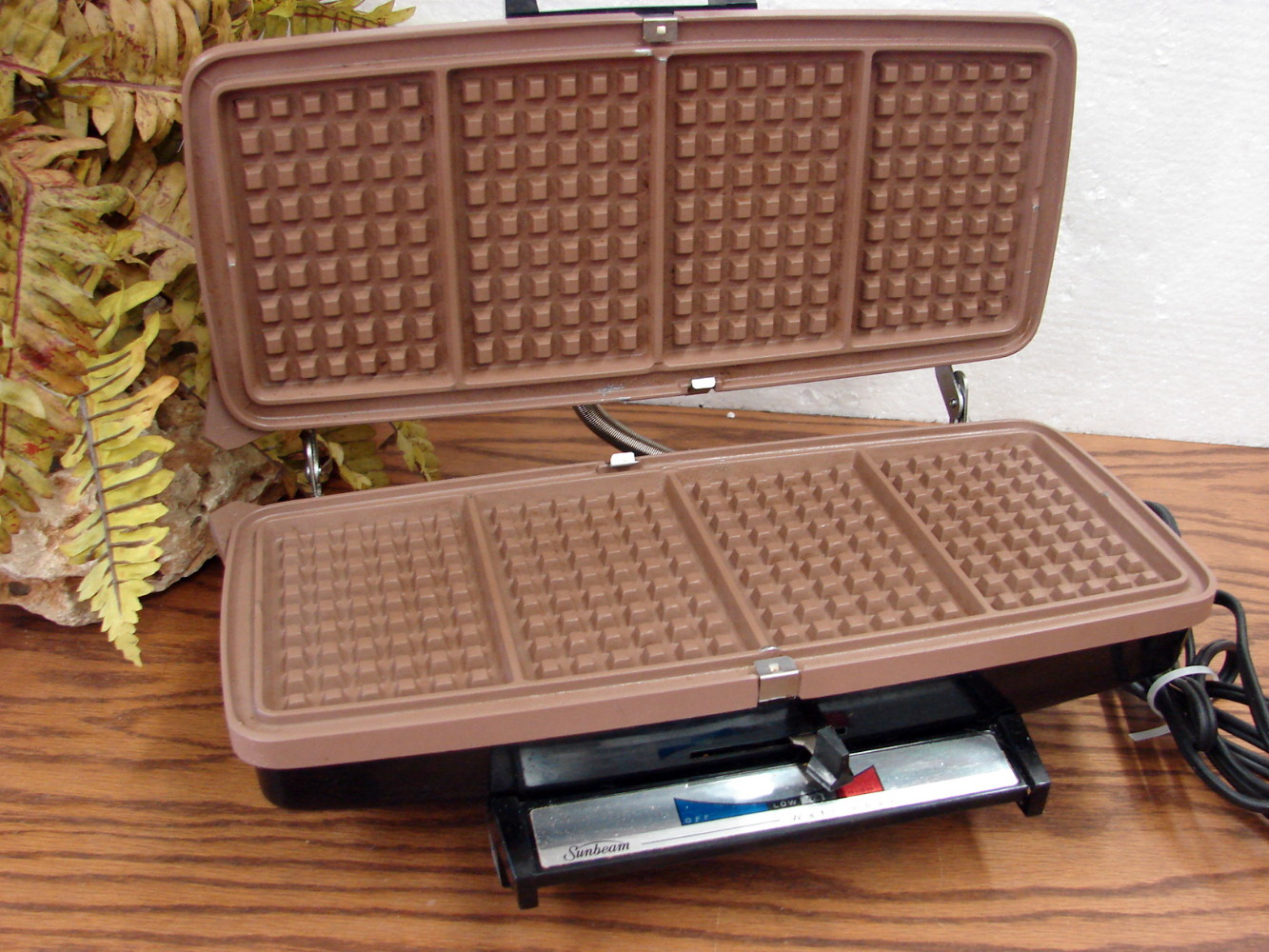 Neat old vintage Sunbeam Electric Waffle Baker and Grill with reversible plates. Works as intended and the plates are easy to flip over for either Breakfast Waffles or Grilling your favorite sandwich. Temperature control on front is easy to access. Measures about 13″. Heavy duty and will last another 50+ years.