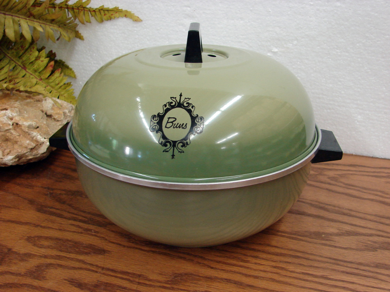 Vintage MCM West Bend Aluminum Avocado Green Fade with Black Accents 3 piece Serving Oven Bun Bread Warmer. Knob on top rotates to let out steam. Nice condition.