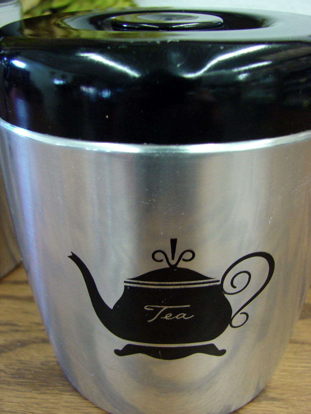 Vintage MCM West Bend Aluminum with Black Accents Tea Canister.  Nice Condition, some shelf wear.