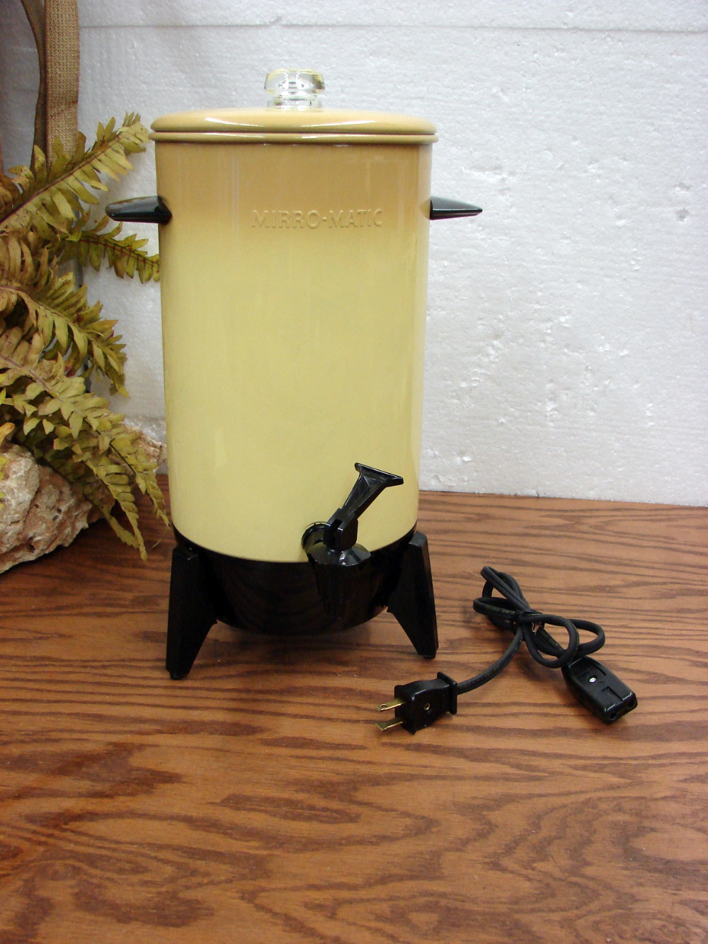 Pre-owned Complete Mirro-Matic automatic 22 cup electric percolator. #9293-35 Harvest Gold Fade that makes about 22 cups. Some staining on inside, but works as intended.