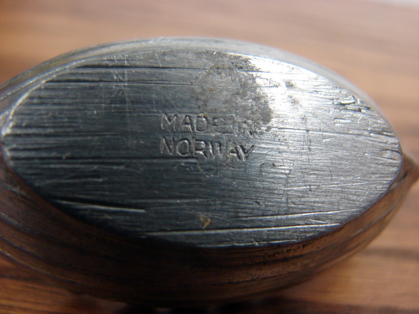 Vintage Pewter viking ship salt cellar complete with spoon from Norway. Measures about 3 1/4″ long and is free from damage.
