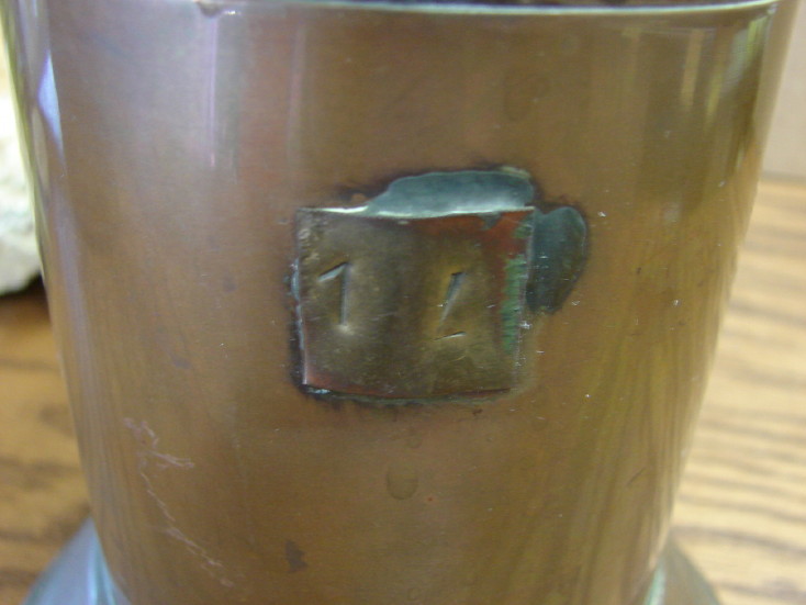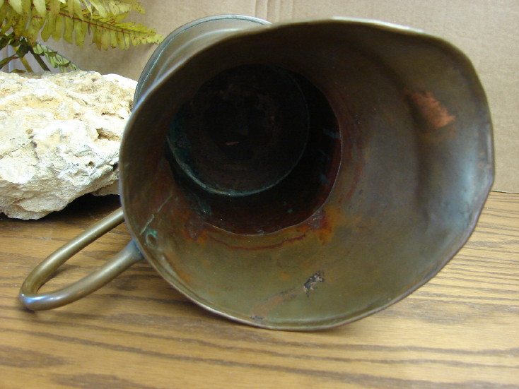 Pitcher on right in image, an awesome Solid Copper flared rim spout and base with tag on front that reads 1 L.  Weighs about 14.20 Ounces.   Measures about 8 1/2 x 5 1/2″.   Any dings and dents are included free of charge.