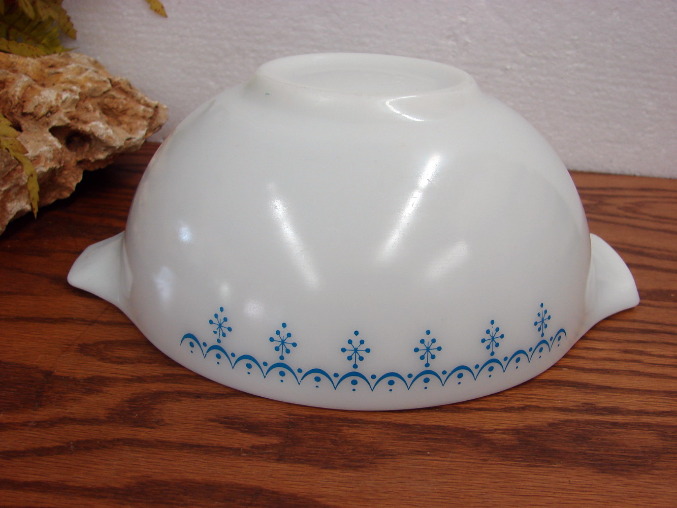 Vintage PYREX Blue Snowflake Garland #443 2 1/2 Quart Nesting Cinderella Mixing Bowl. Little to no wear. More of this pattern also available.
