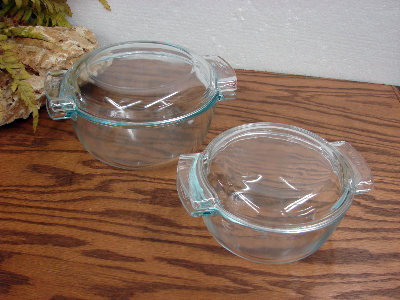 Vintage PYREX Glass Clear Blue Tint France de Corning oversized handle lidded casseroles w/ Matching Lids. Fat handles make it easy to use grasp. Previously enjoyed and have normal wear but are free from damage. This one is a set of two #451 and #453 that measures about 6″ and 7 x 4″. Other sizes also available.