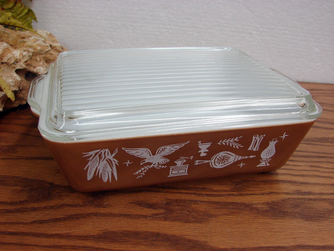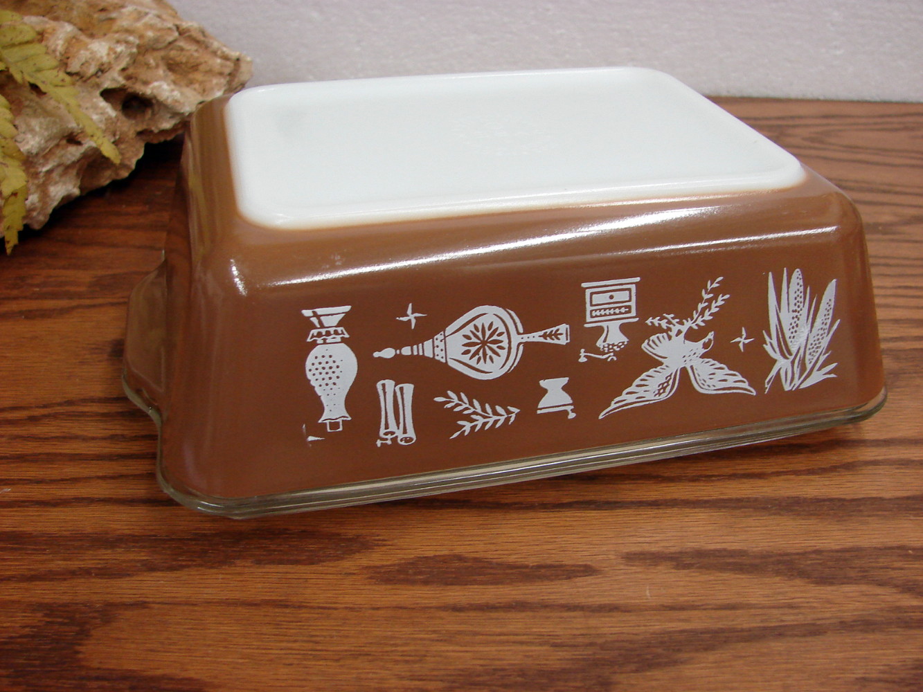 Vintage White Brown and Gold patterned PYREX Early American. This is a #503 Refrigerator Dish w/ matching lid. Holds about 1 1/2 quarts. Little to no wear. Many other options in this pattern also available.