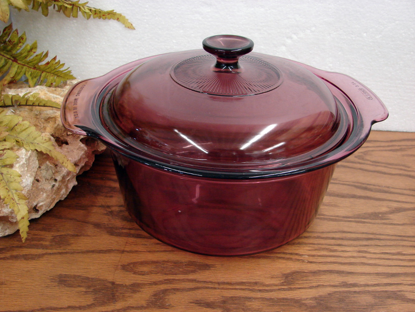 Vintage PYREX Glass Visions Cranberry Plum Shade 3.5 Liter Non Stick textured on outside bottom w/ matching lid. Previously enjoyed and free from damage. Many more options of Visions PYREX pieces also available.