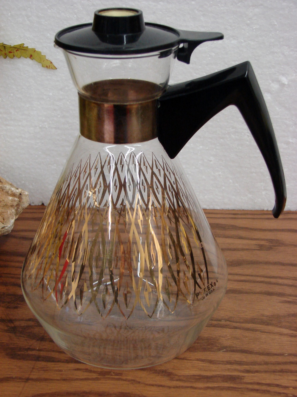 Vintage PYREX 6-8 cup Pitcher Carafe complete with lid. Measures about 8 1/2″ tall. Triangle pattern all around with minor loss of Gold Paint. More options like this also available.