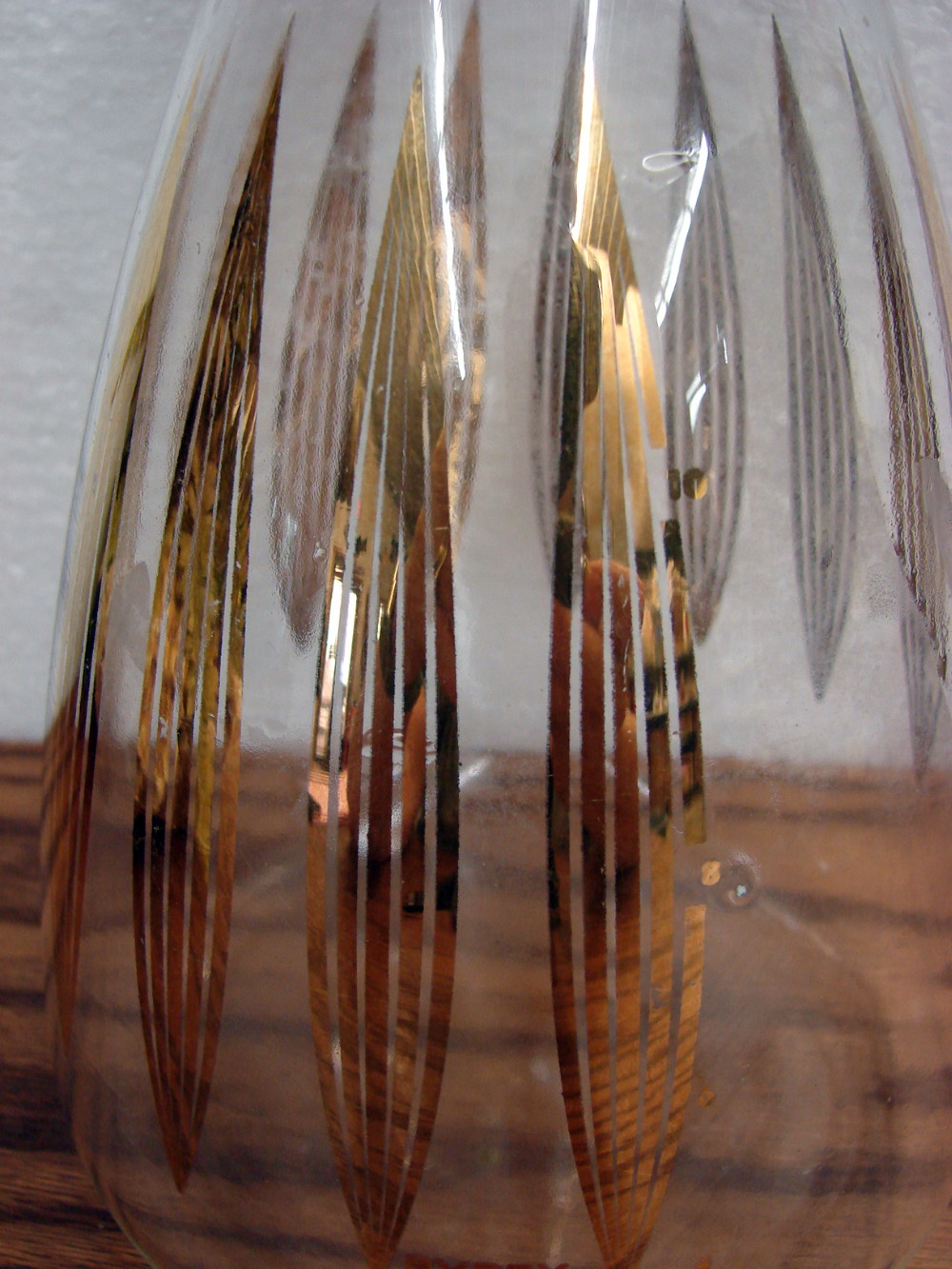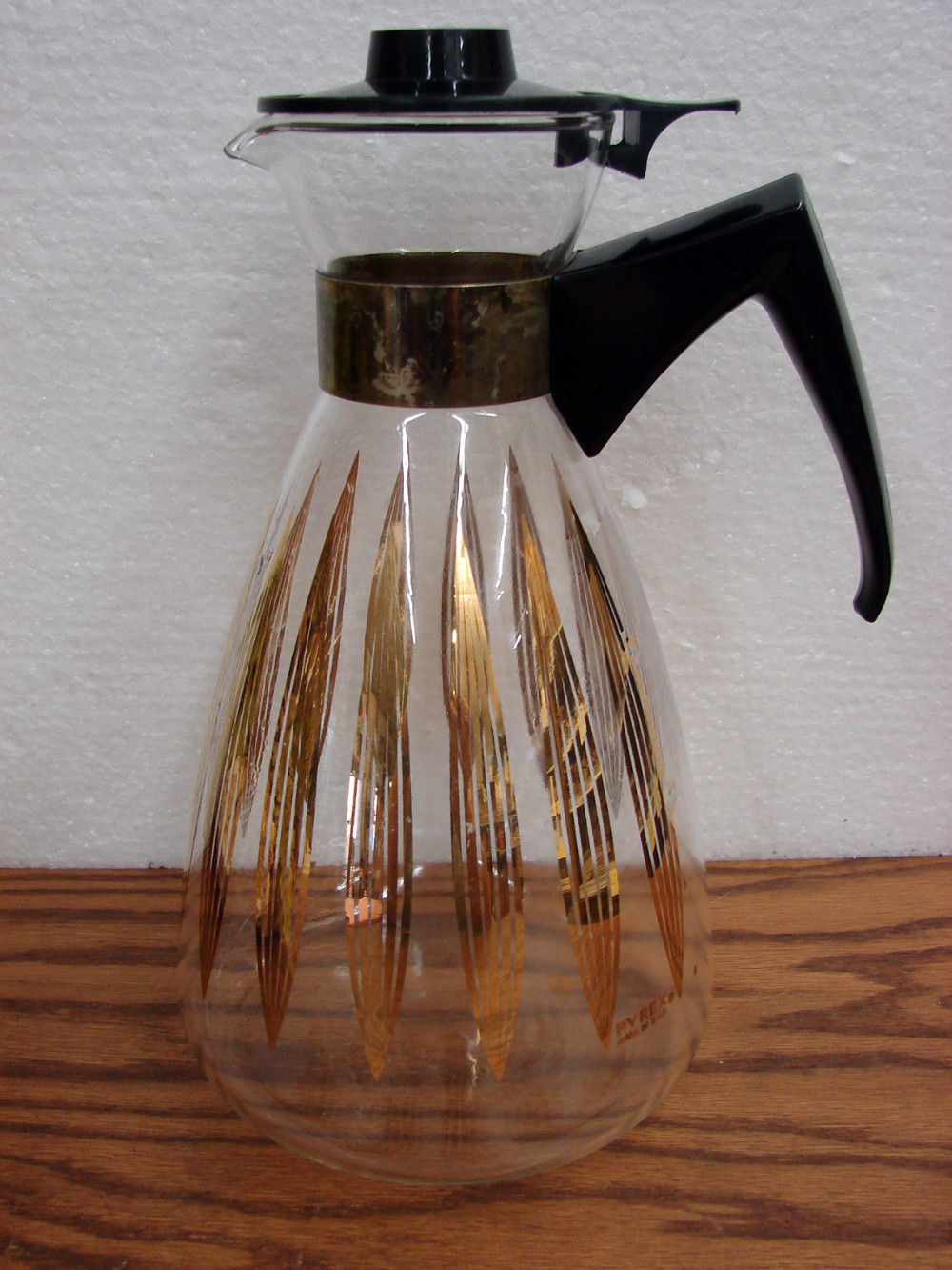 Vintage PYREX 10 cup Pitcher Carafe with fat Gold Striped Leaf Pattern. Minor loss of Gold trim. More options like this also available.