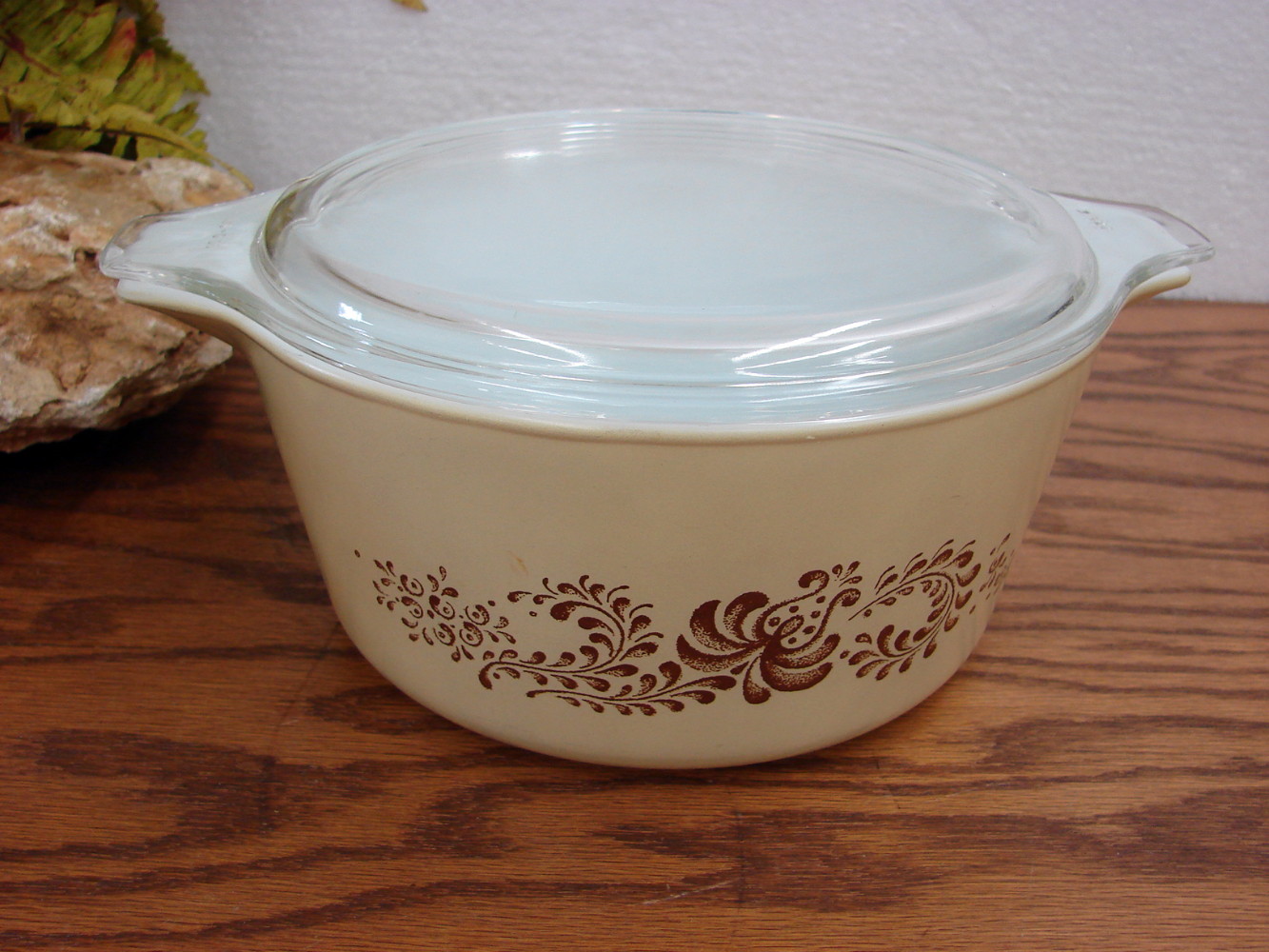 Vintage PYREX Homestead Brown Pattern #474 with Clear Lid. Lid has a small flake.
