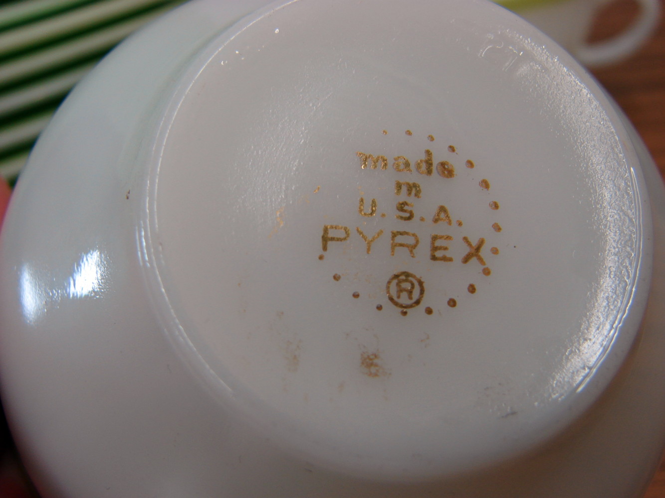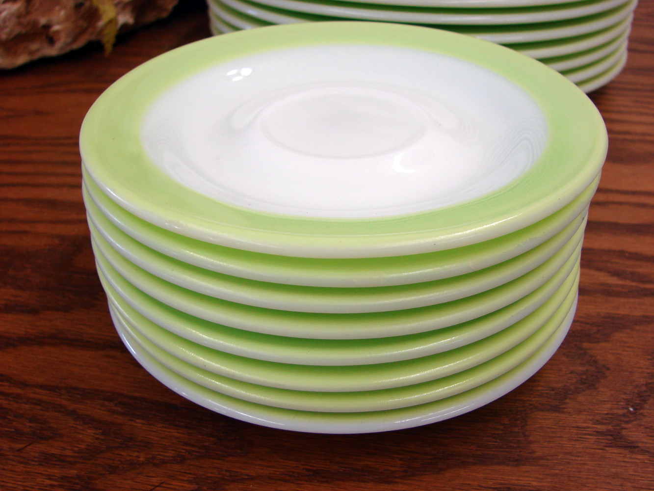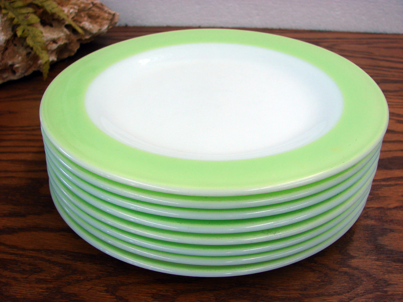Set of 16 pieces of  vintage PYREX Lime Green Banded dinnerware.  This set includes Two sets of Cups and Saucers, Set/8 Bread/Butter Salad Plates that measure about 8 1/4″ and a Set/4 Dinner Plates that measure about 10″.  The dinner plates need a quick wipe down with Peek to remove the utensil marks along the border, but as you can see they clean up beautifully.   Previously enjoyed of course.