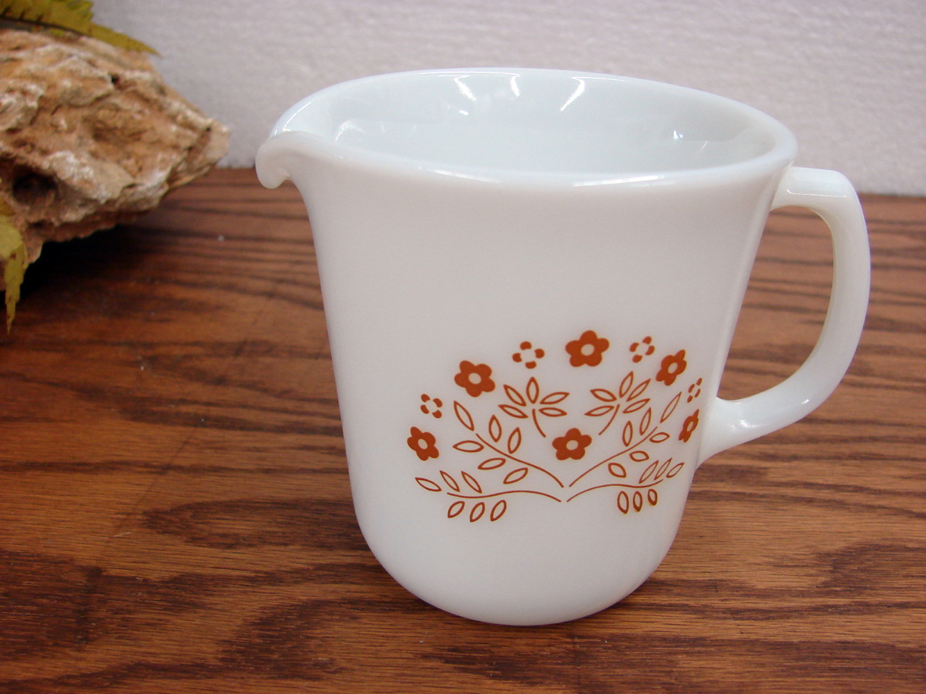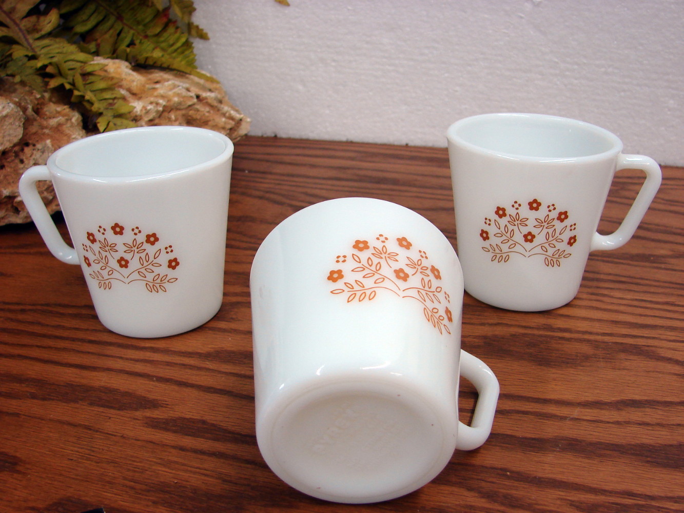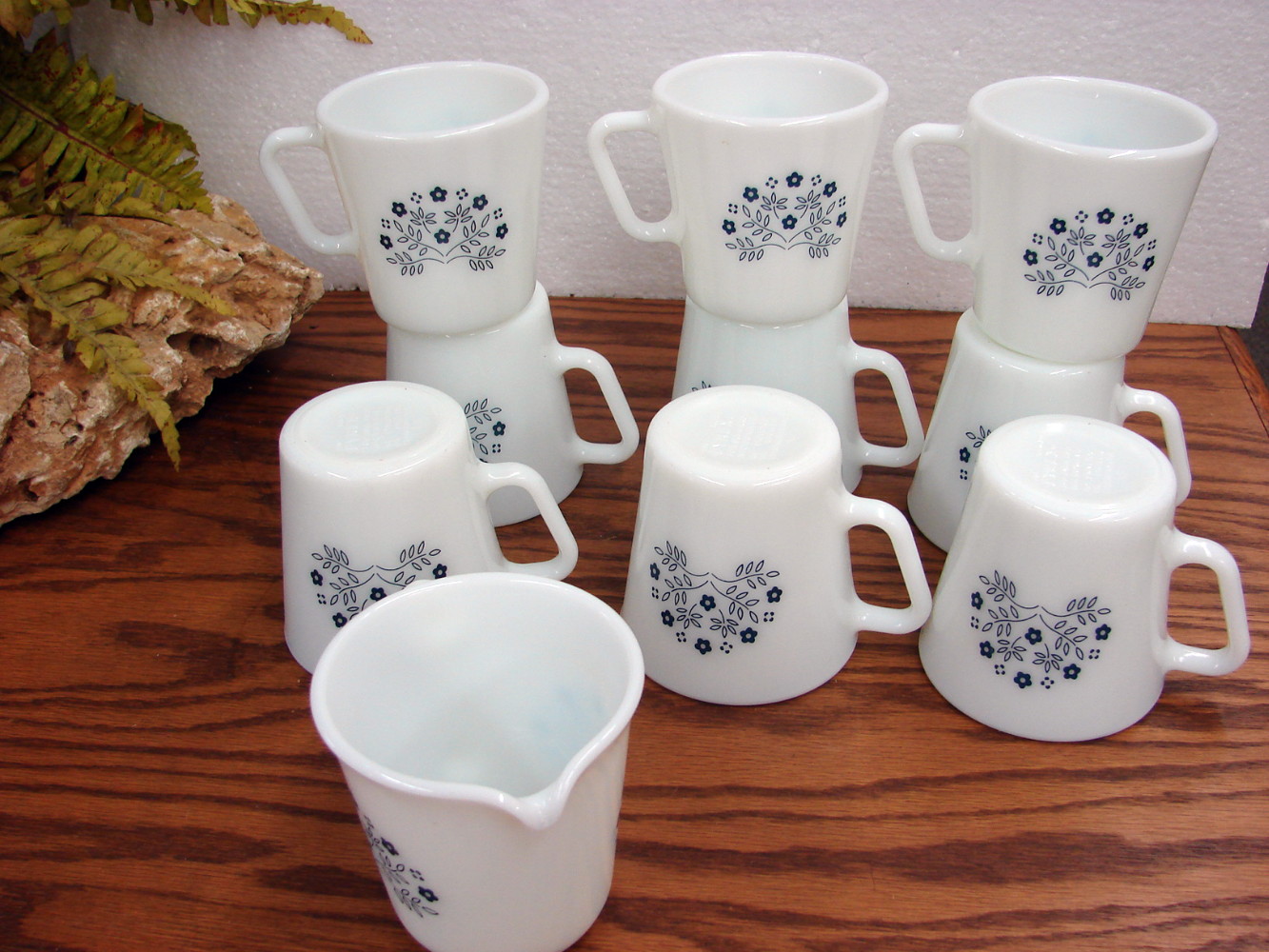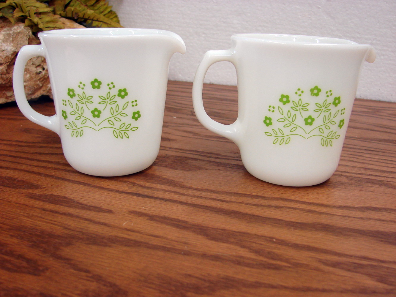 Vintage PYREX Summer Impressions tiny flower Creamers and D Handle Mugs. This lot includes 2 Green Creamers, One Blue Creamer, One Brown Creamer, 9 Blue D Handle Mugs and 3 Brown D Handle Mugs. All free from damage.