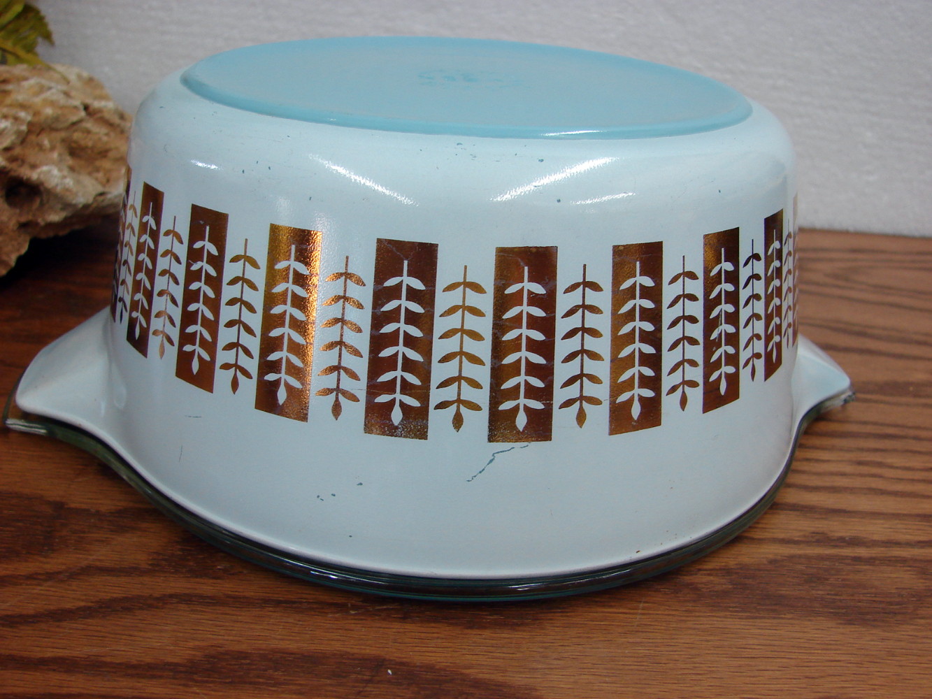 Vintage PYREX Gourmet Gold Leaf with Delphite Blue inside #475 2 1/2 Quart Round Casserole with clear 475 lid. Normal Use wear. Beautiful colors! Other PYREX Gold and Golden casseroles also available.