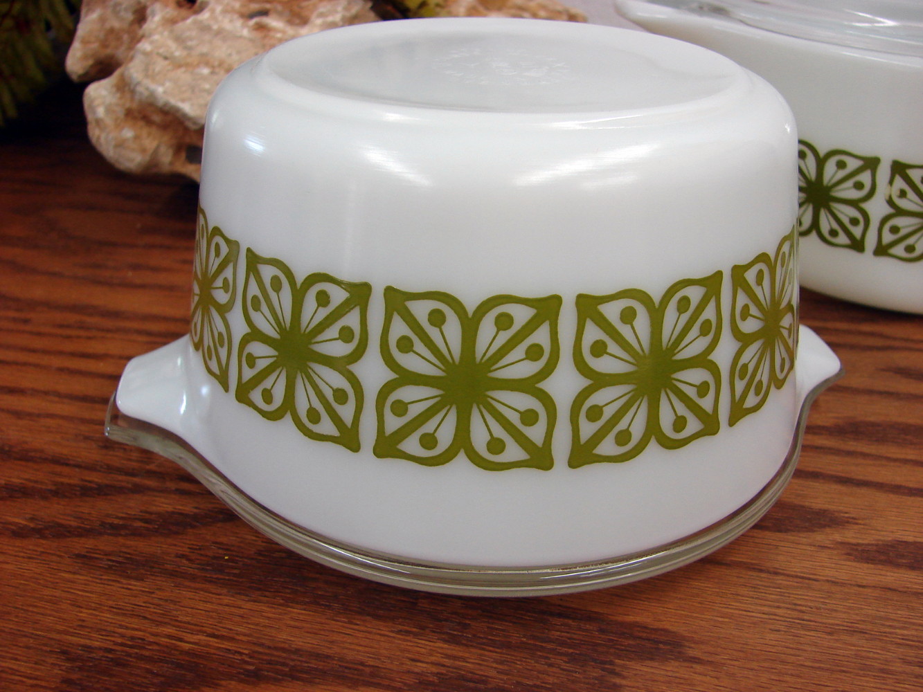 Vintage PYREX Verde Green Autumn Floral Square Flower Patterned #473 Cinderella Round Casserole w/ Lid. Holds about 1 Quart. Little to no wear. One picture on top of the #474 in first image. Many more options of this pattern available.