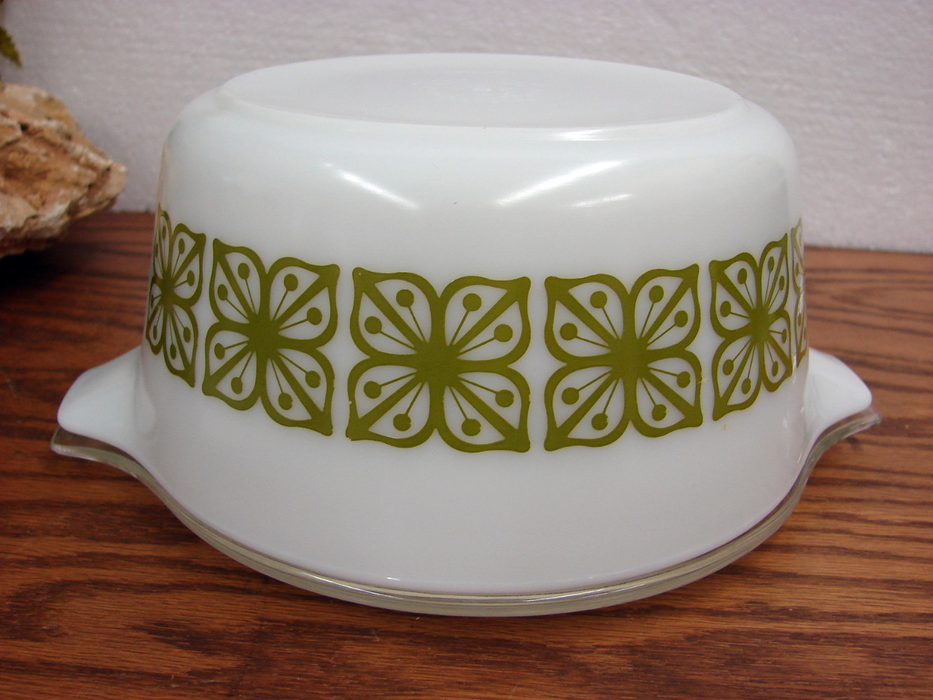 Vintage PYREX Verde Green Autumn Floral Square Flower Patterned #474 Cinderella Round Casserole w/ Lid. Holds about 1 1/2 Quart. Little to no wear. One pictured on bottom of the #473 in first image. Many more options of this pattern available.