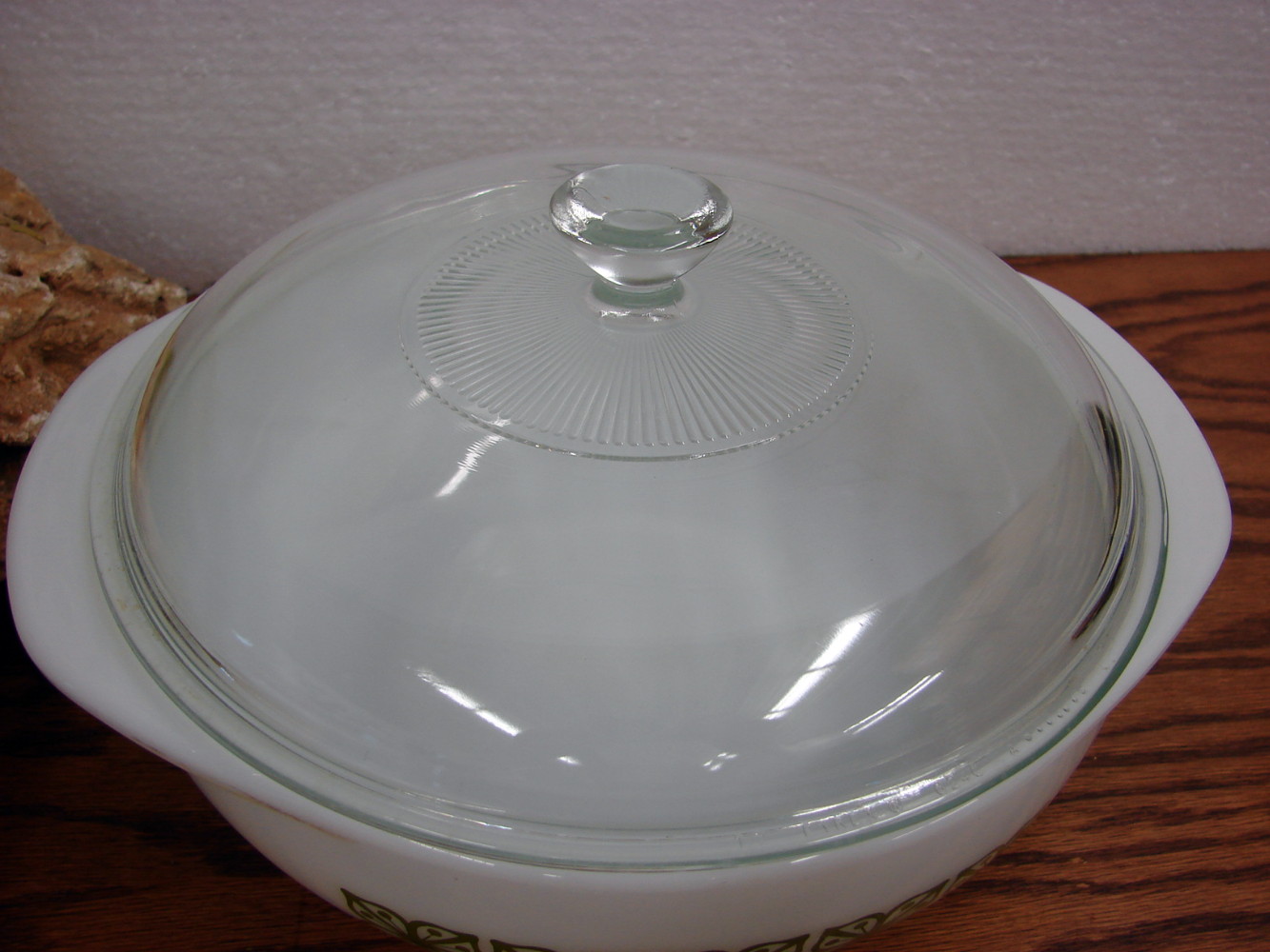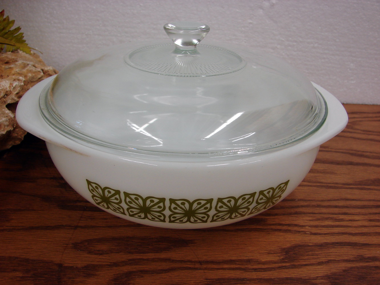 Vintage PYREX Verde Green Autumn Floral Square Flower Patterned. #024 Round Casserole that holds about 2 quarts, complete with lid. Little to no wear. Many more options of this pattern available.