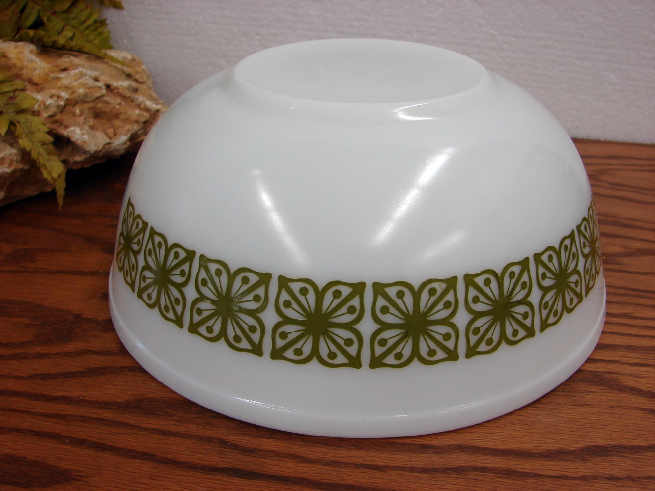 Vintage PYREX Verde Green Autumn Floral Square Flower Patterned. #404 Round Nesting Mixing Bowl that holds about 4 quarts. Little to no wear-a couple tiny black marks. Many more options of this pattern available.