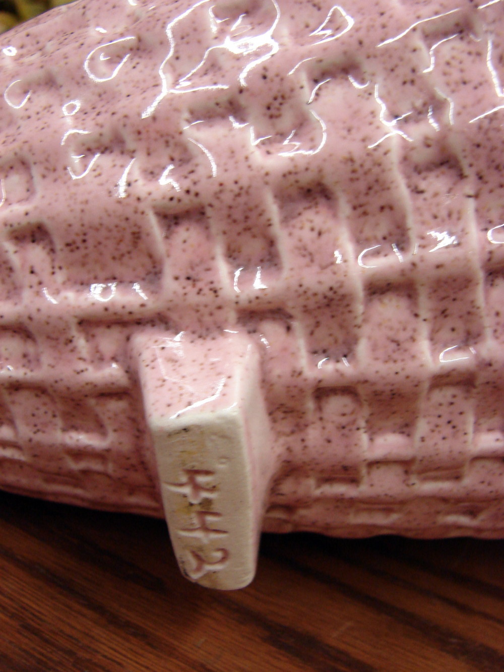 Gorgeous large Red Wing Pottery Mid Century Modern Footed Horn of Plenty in Pink basket weave with Lavender inside. #442  Measures about 15″ long by 9″ wide and is free from damage.