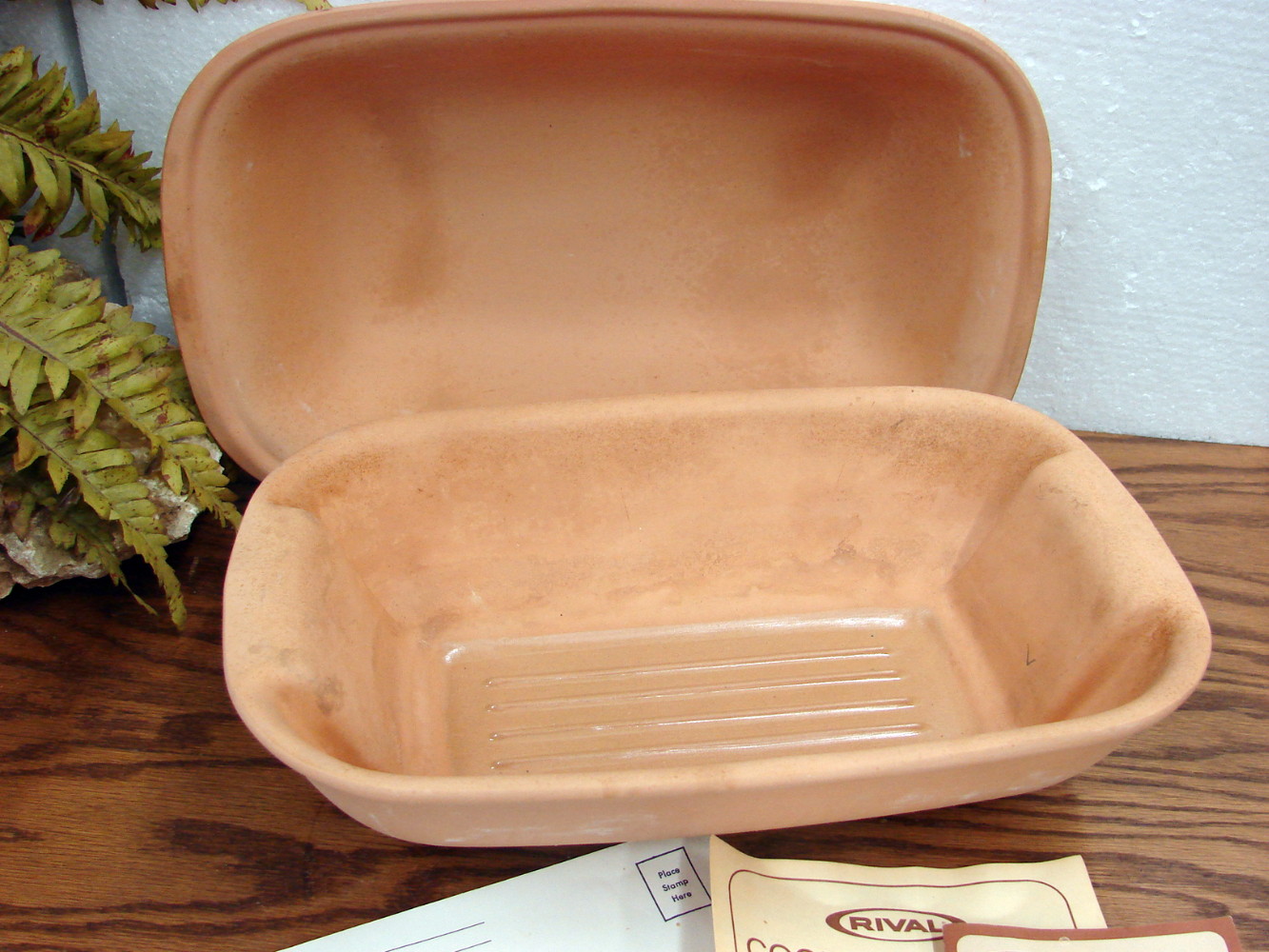 Vintage USA made Rival Naturelles Romertopf clay baker #4673 made in USA. Includes recipes/instruction booklets. Measures about 14″ long by 7″ tall by 9″ wide and has been previously enjoyed/seasoned. Free from damage. Makes awesome whole roasted chicken. Perfect for Microwave or Oven.