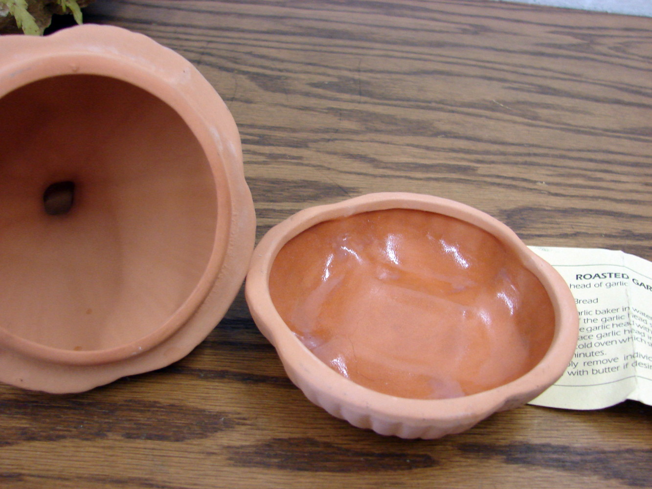 Vintage Romertopf clay Garlic baker. Made in Mexico. Includes instructions, do not believe it was ever used.