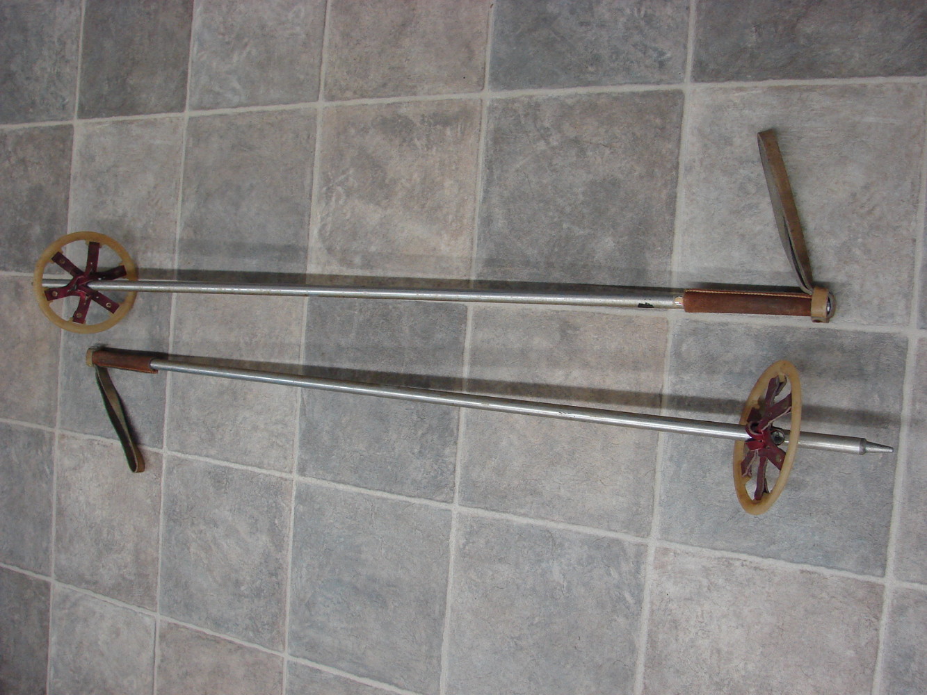 Unique leather grip and leather strap basket around a rubber feeling hoop. Measure about 46″ long with a 6″ basket. Ready for fun! Perfect to hang on the wall with your old skis or snowshoes. A variety of vintage Ski Poles also available here.