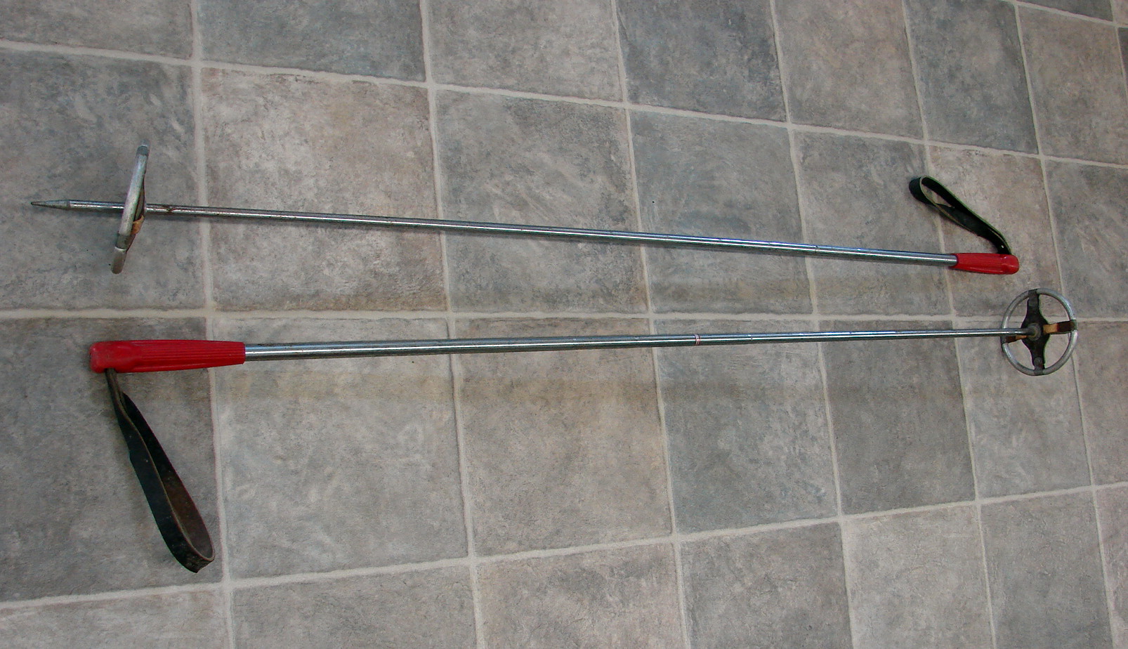 Aluminum Red Molded Handles Sticker reads: True Temper Step Down that measure about 51″ with 4 3/4″ Baskets. Perfect to hang on the wall with your old skis or snowshoes.   A variety of vintage Ski Poles also available here.