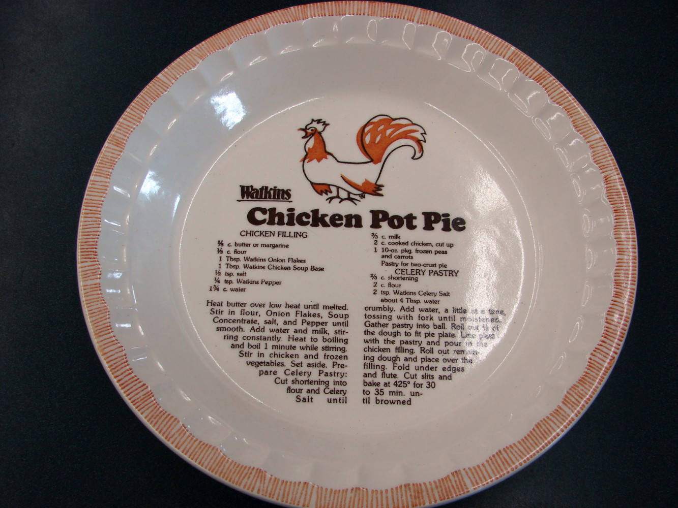 Watkins recipe deep dish Pie plate. This one is the Chicken Pot Pie #6295. Measures about 11 by 1 3/4″ and is free from damage. Many more Watkins pie plates options also available.