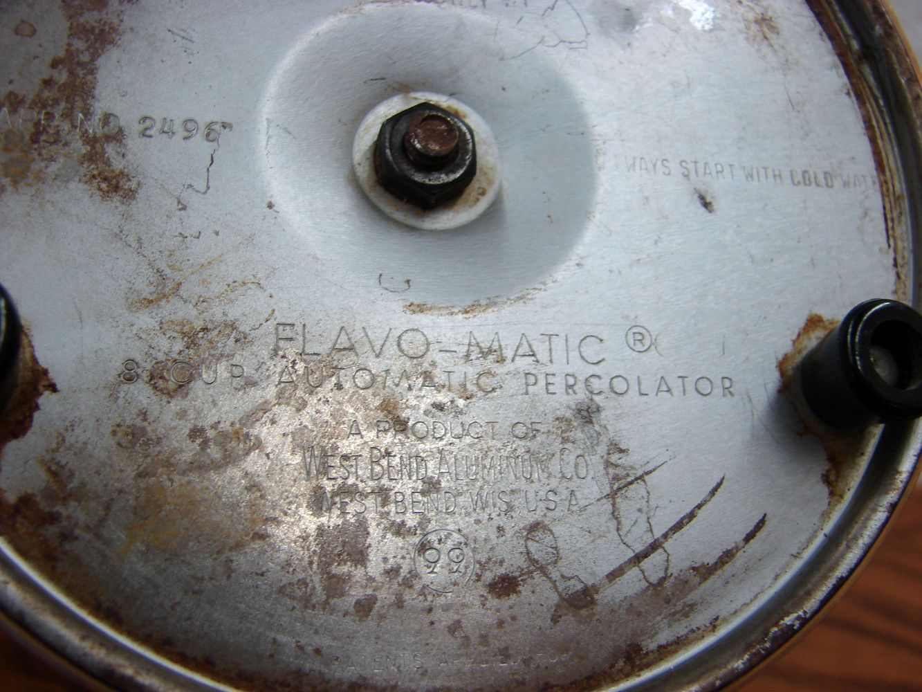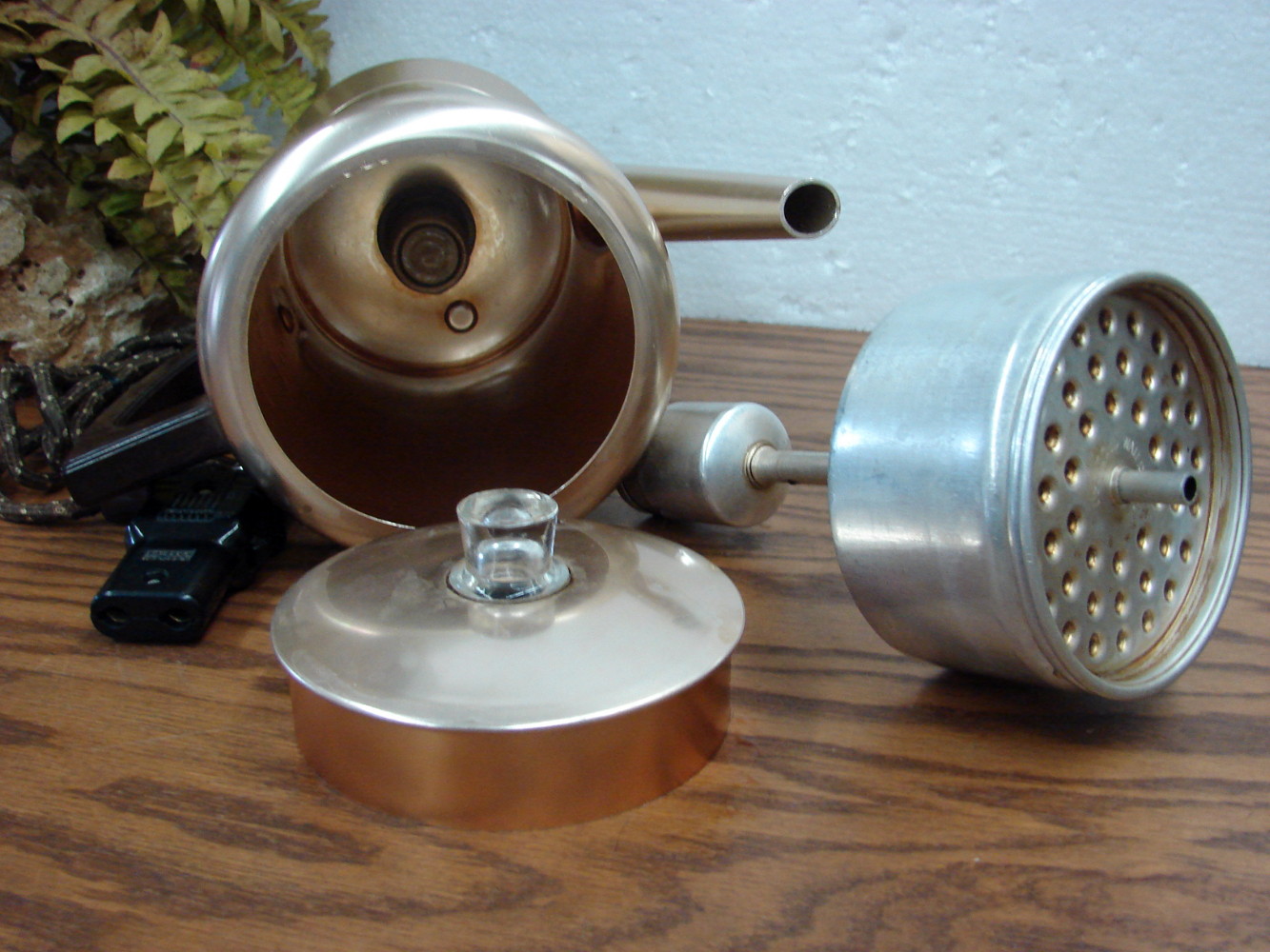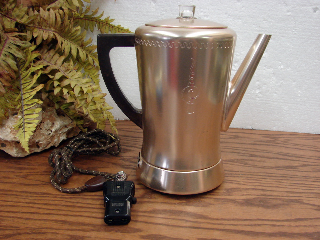 West Bend Champagne color Anodized Metal electric percolator with original cloth Leviton cord that has an Off/On switch on it. Tested, complete, working and ready to go.