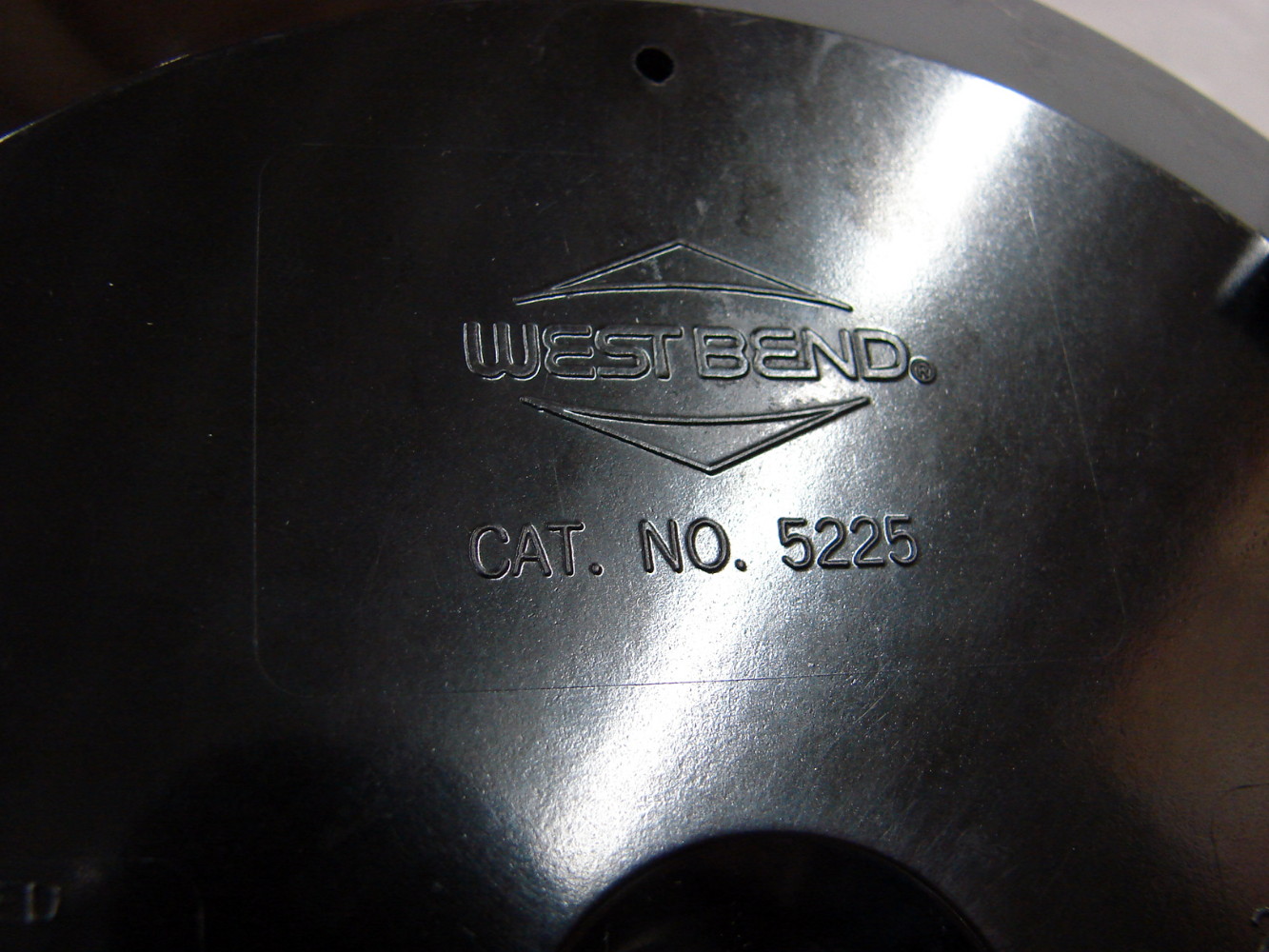 Vintage West Bend #5225 Lazy Day Slow Cooker with base, pot, lid and cord. Holds about 6 quarts.  Some light wear inside the pot and on the base face.   Tested and heats up.