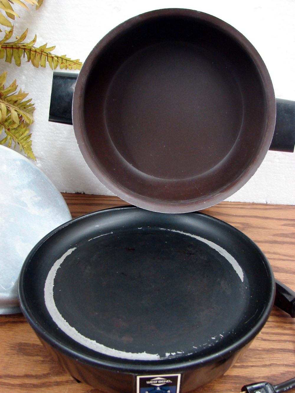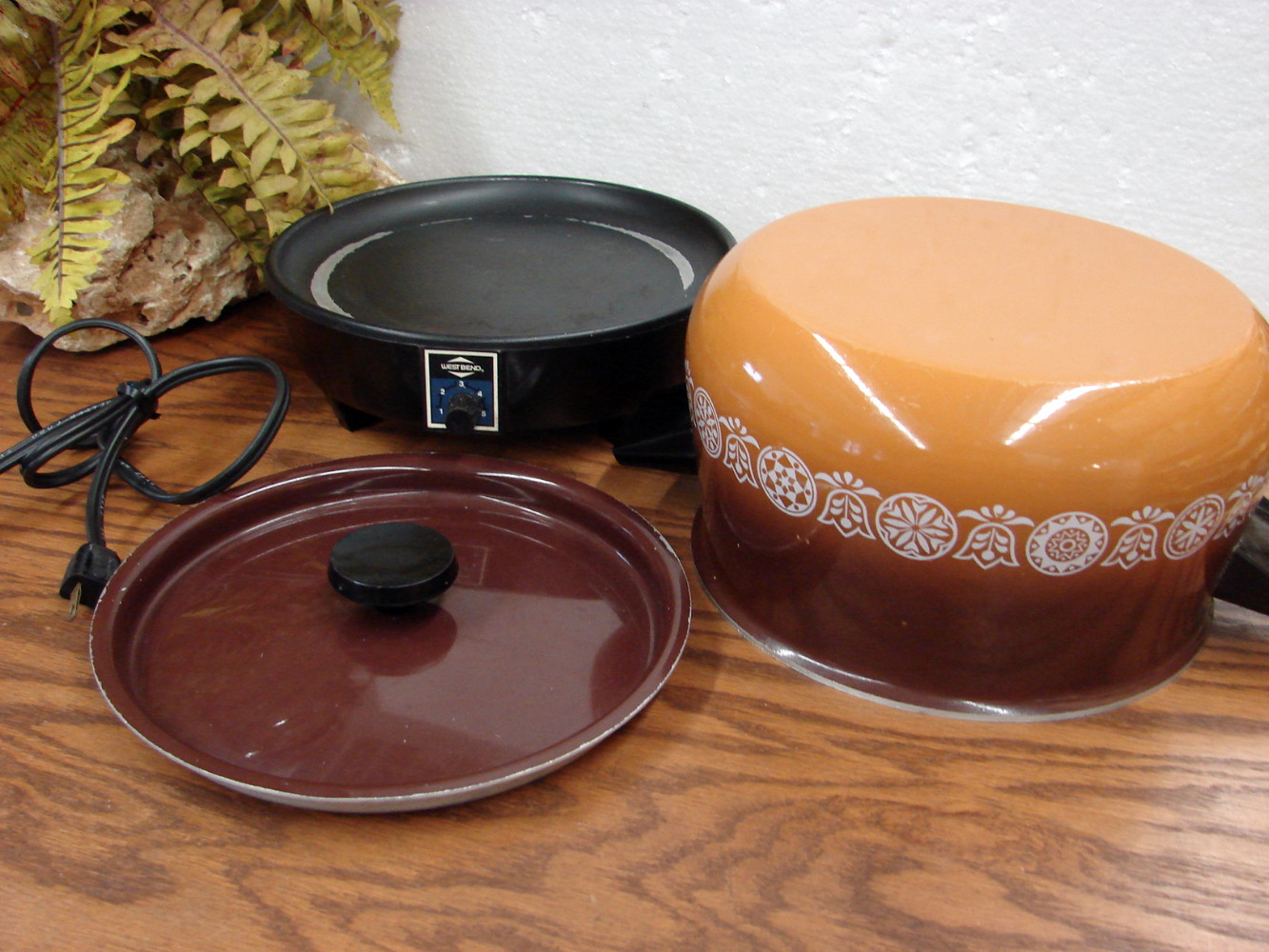 Vintage West Bend Lazy Day Slow Cooker Pot with Sunset Flower Band and Black/Blue base. Holds about 6 quarts. Pot is like new, base has a worn ring but was Tested and heats up. A marriage made in Heaven.