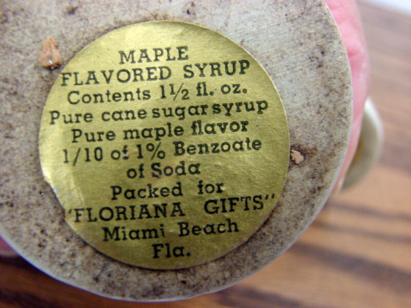 Set of three antique stoneware mini jugs that were used as a souvenir from a Maple Syrup store in Florida. Missing the clear plastic lid that fit over the top of the cardboard base. Corks are still intact, although it is doubtful if any product remains. Smallest measures about 2 1/2″ tall, tallest about 3 3/4″. Free from damage.