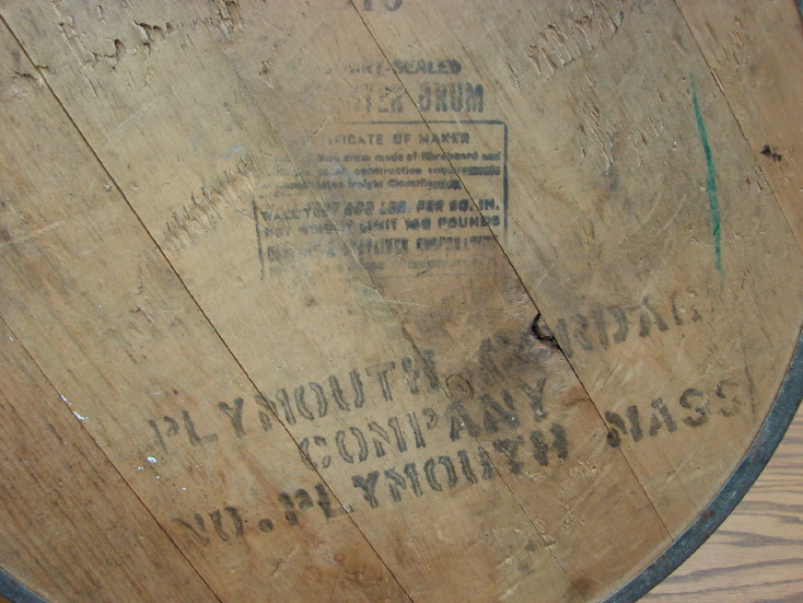 Unique antique fiber paper pulp large round lidded container with a ocean themed nautical coastal theme. Wooden lid with tons of character and original labels/writing. Paper label on front reads (partial) Plymouth Nylon Sheehan Carrier Rope Trade Mark 1824. Original wooden lid and container is that paper pulp fiber composite that was used in the good ole days. Metal band around the bottom and even includes the original paper liner on the inside bottom. Neat old piece to decorate with.