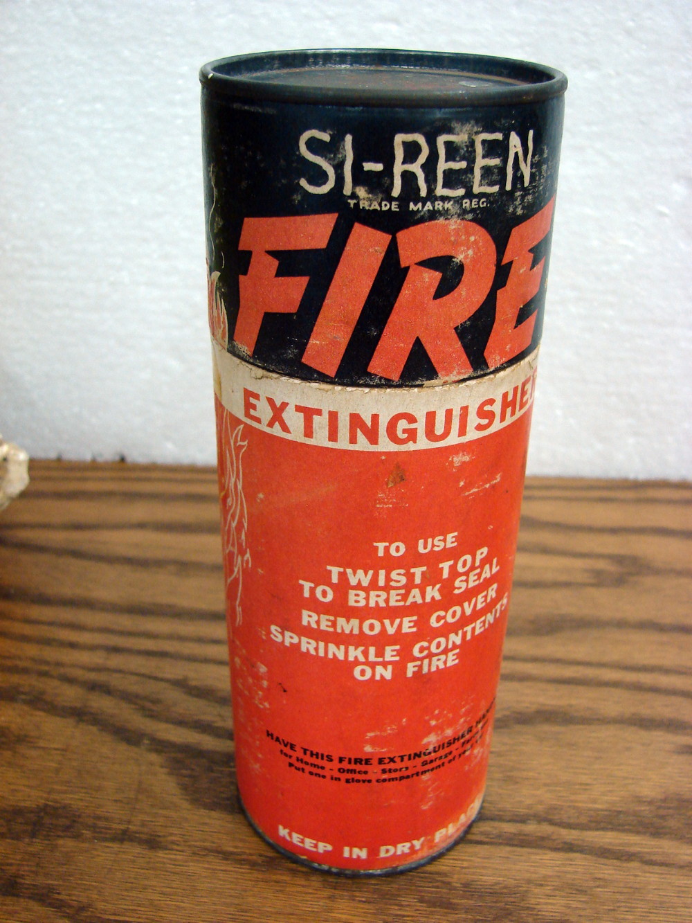 Antique cardboard canister of Si-Reen handy fire extinguisher. Has been opened but feels full. Some shelf wear.