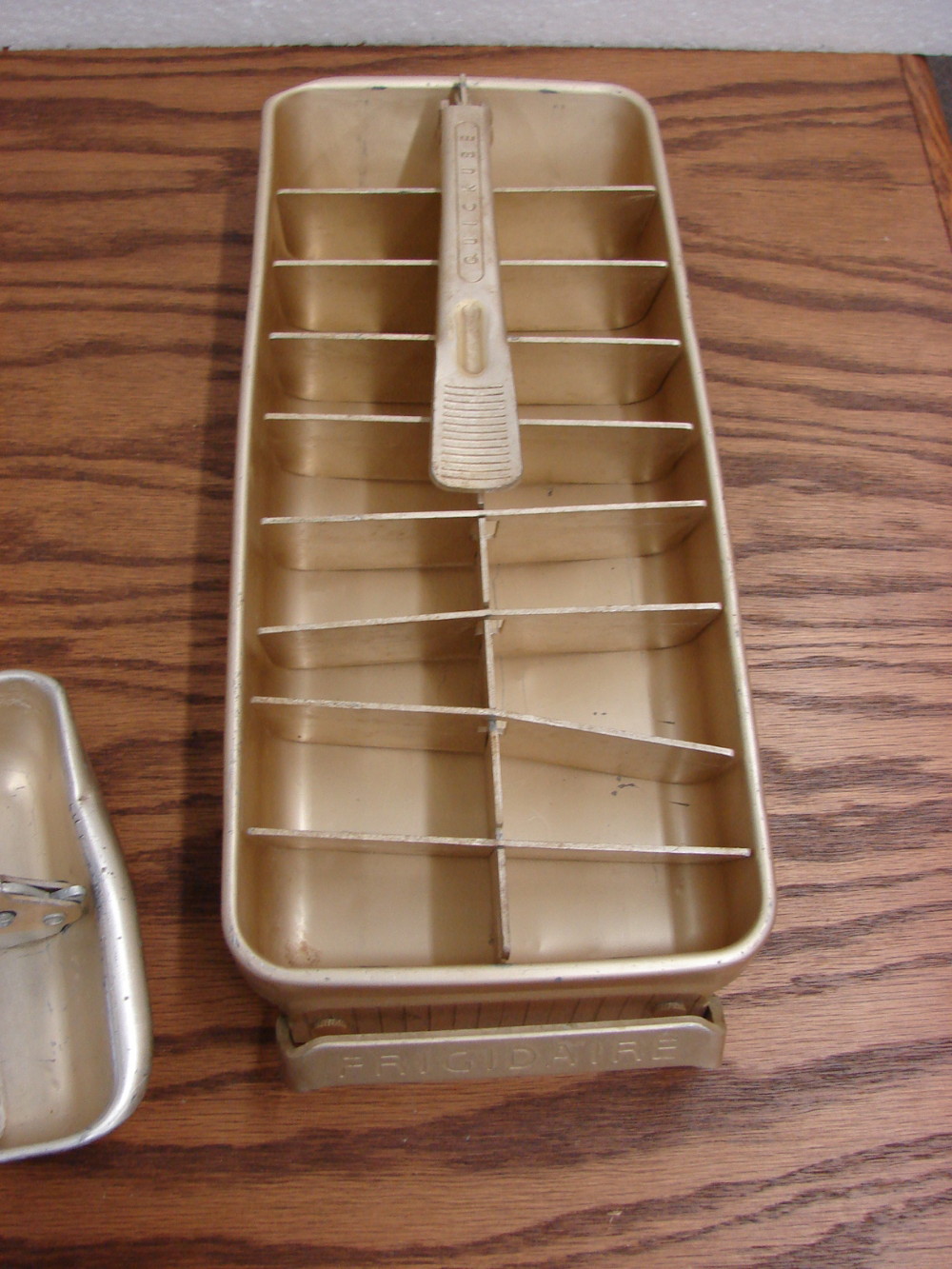 Choice of vintage GE, No Name, Onyx and Frigidaire aluminum handled ice cube trays for your cabin fridge. Just lift the handle and it loosens the cubes for a quick iced drink. Select an option to view pictures and pricing. All have been used (except for one option) and some may have dents and/or hard water film.