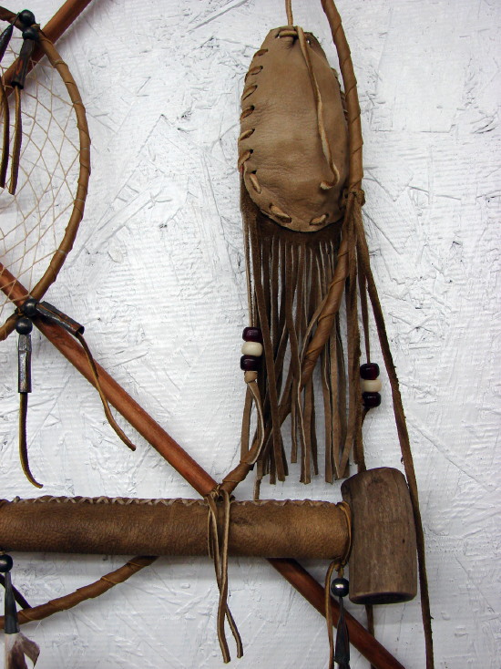 Authentic vintage Navajo Ceremonial Peace Shield dream catcher with Pipes, medicine bag, arrows and medicine wheel. Comes complete with Certificate of Authenticity. Real antler, glass seed beads and feather accents and measures a whopping 2 foot wide by 4 foot long. Beautiful workmanship and looks awesome on the wall of your log home. Authentic craft of the South West Navajo.