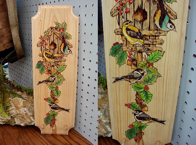 One of a kind hand wood burned and then hand painted Backyard Songbirds on a wood slab with pegs. Measures about 17″ tall by 5 1/2″ wide. A perfect unique piece for your cabin. Signed Zig.