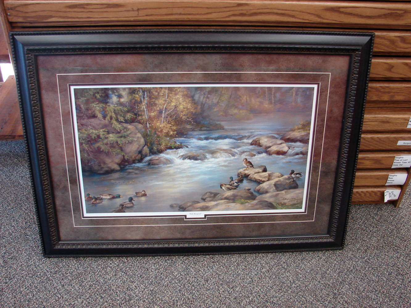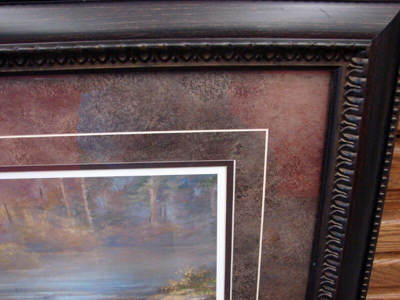 Gorgeous framed and matted Russ Docken picture titled Fall Hangout. Print measures about 24 x 14″, framed measures about 35 1/4″ x 25 1/4″. Previously enjoyed with hardly noticeable minor corner wear. Gorgeous frame and if new would cost over $330.
