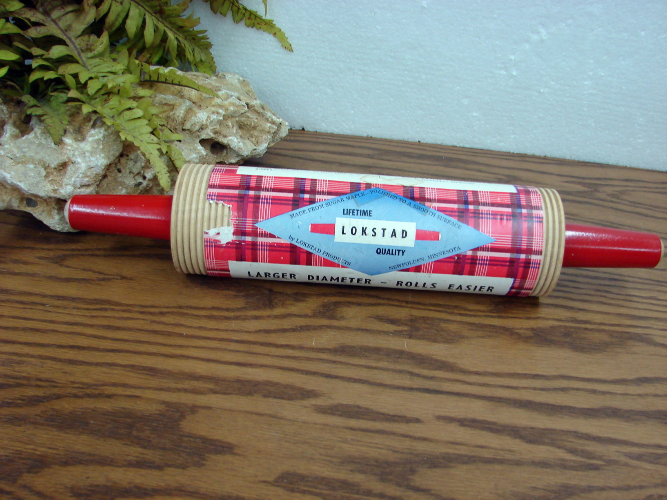 Vintage brand new Lokstad Lefse Swedish Scandinavian wood ribbed rolling pin with red handles. Original sleeve still attached with recipes. Head measures about 10″ long. Perfect for Lefse, flat bread and other treats.