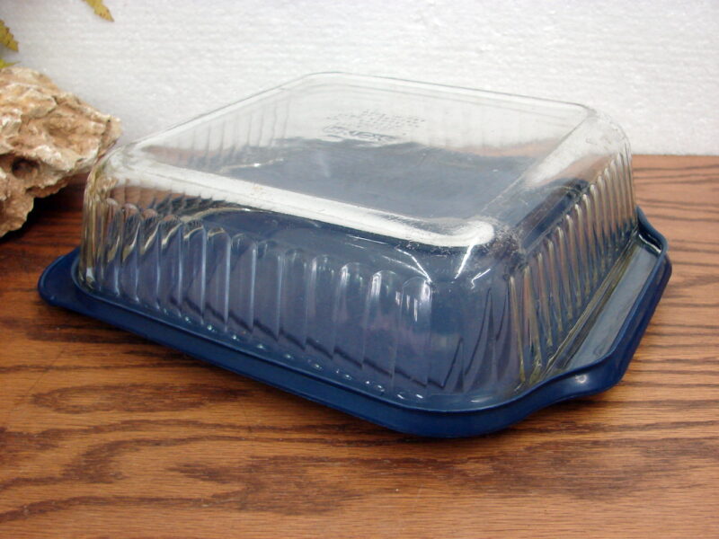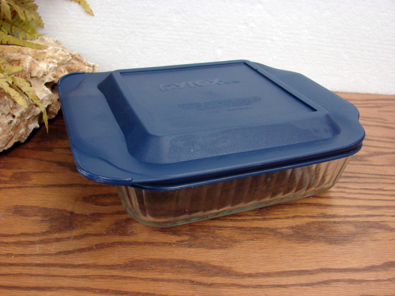Newer Pyrex #222 8 x 8 x 2″ square baking dish with storage lid. Ribbed sides and free from damage.  Holds about 2 quarts.