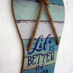 Brand new over sized wooden flip flop shaped wall sign with real jute strap. Measures about 22 1/2″ long by 10 1/2″ wide. Reads Life is Better in Flip Flops.