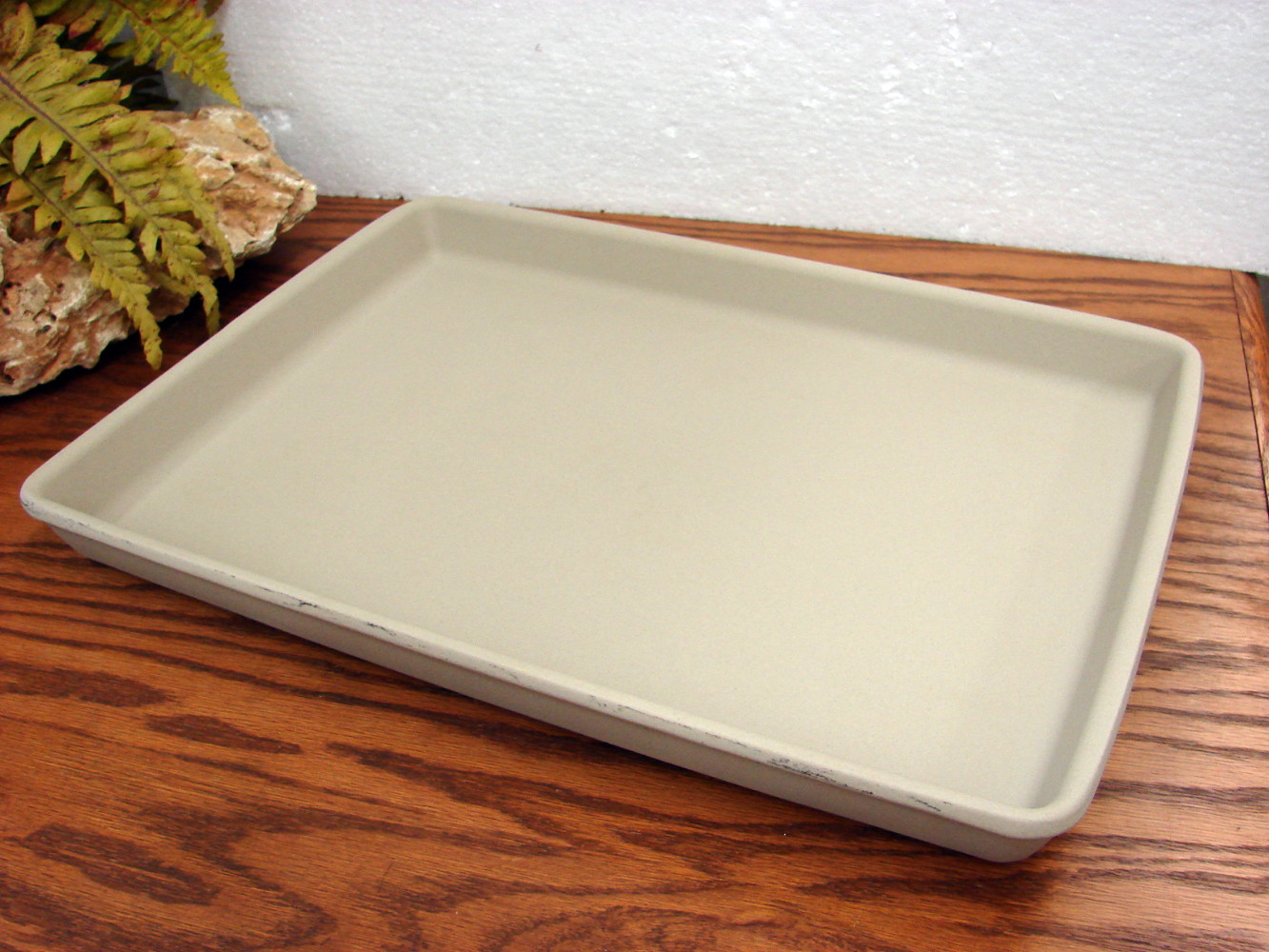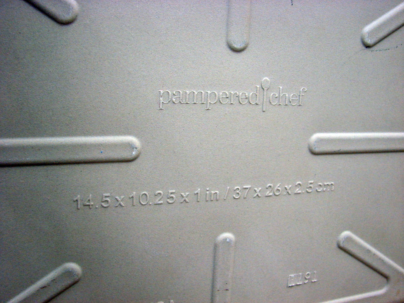 Pampered Chef Stoneware 16 x 11 3/4 x 1 1/2″ bar pan cookie sheet measures 14 1/2 x 10 1/4 x 1 inside.   Not sure it was ever used.