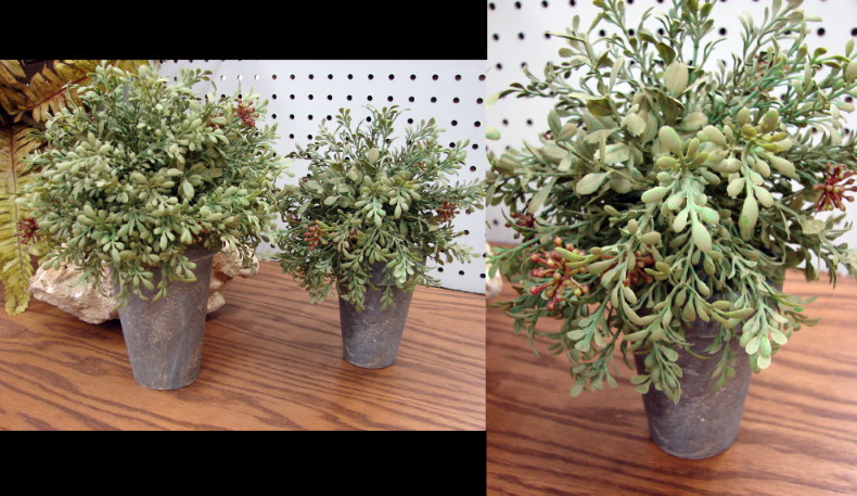 Brand new very realistic set of two Mini Leaf Berry shrub in pots. Large measures about 8″ wide by 10″ tall, smaller measures about 8″ tall by 5″ wide. Perfect for those corners where nothing grows or to add a touch of green to a shelf or windowsill.