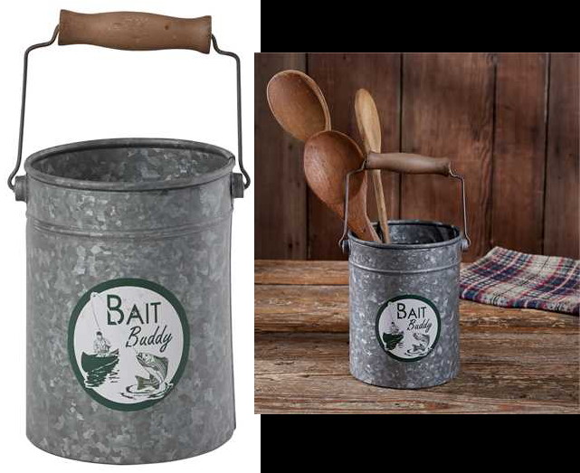 Brand new retro Tin Bait Bucket Fishing Themed utensil holders from Park Designs. Quality all the way-right up to the wooden bail handle. Caddy measures about 9″ long by 6″ wide by 5″ tall not counting the bail handle. Crock measures about 6 3/8″ tall by 5 1/4″ wide not counting the handle. Perfect touch for your camper or cabin. Matching table lamp available below.
