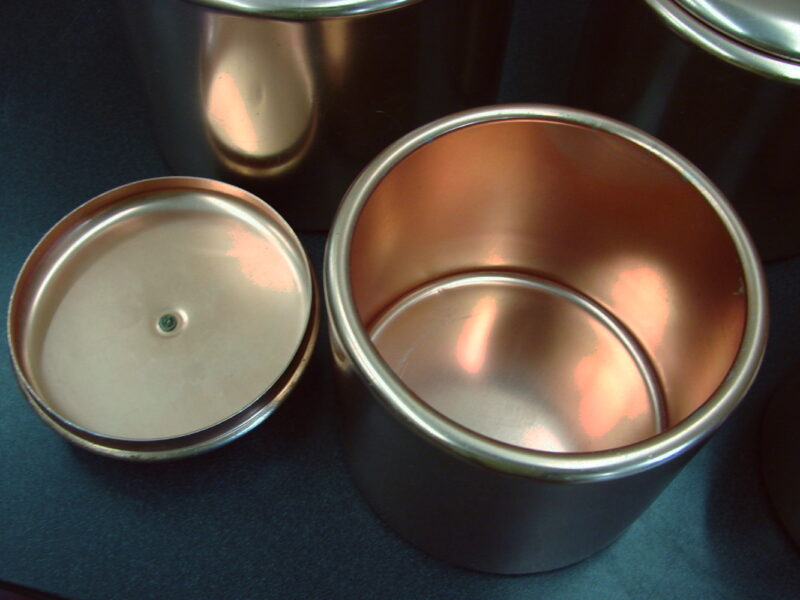 Set/4 Vintage Mirro Aluminum Copper Tone Canister Set Large Wood Knob Lids