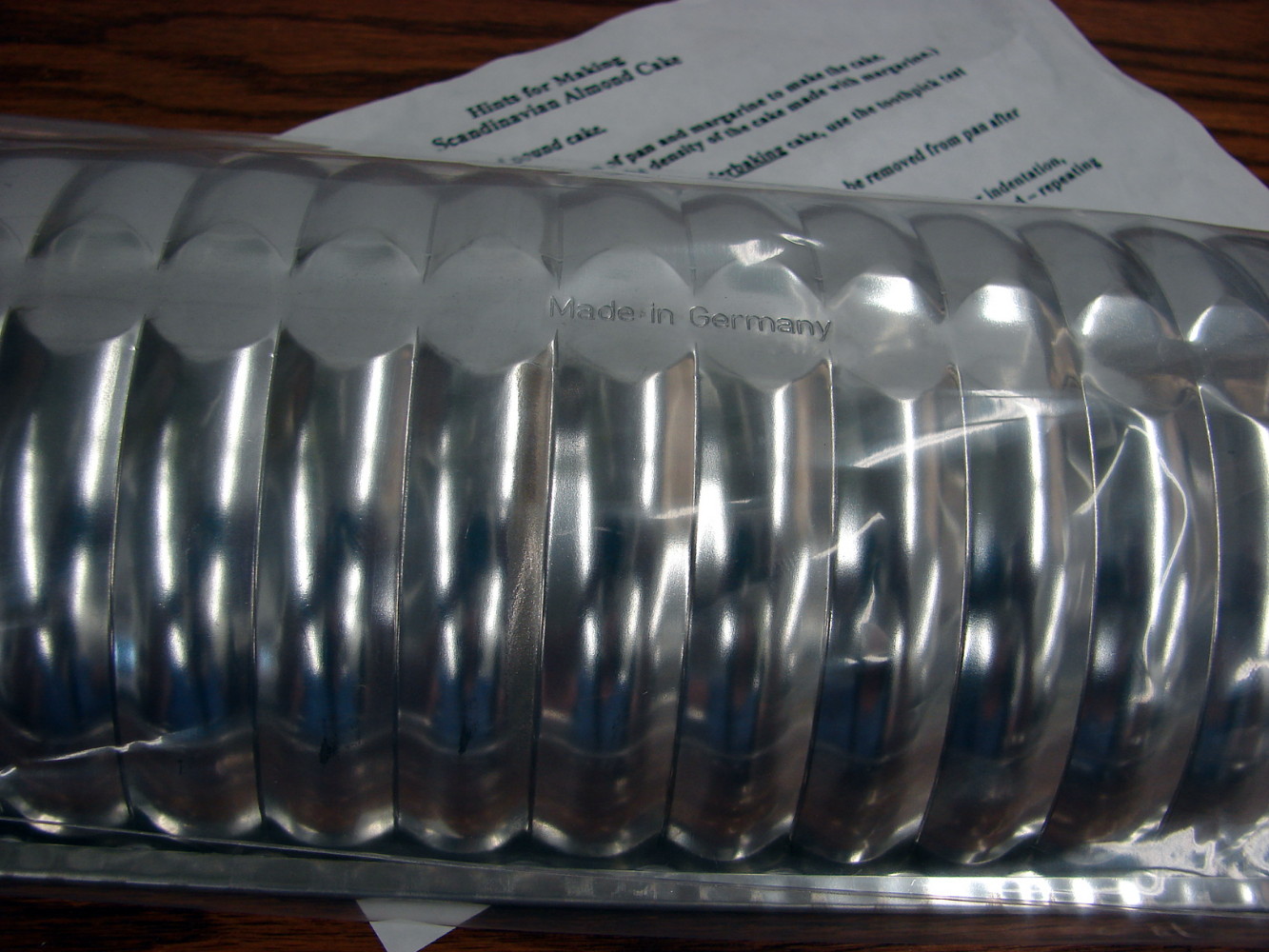 Made in Germany Almond Cake Mold Pan. Measures about 12 1/4″ by 4 3/4″. Complete with recipes.