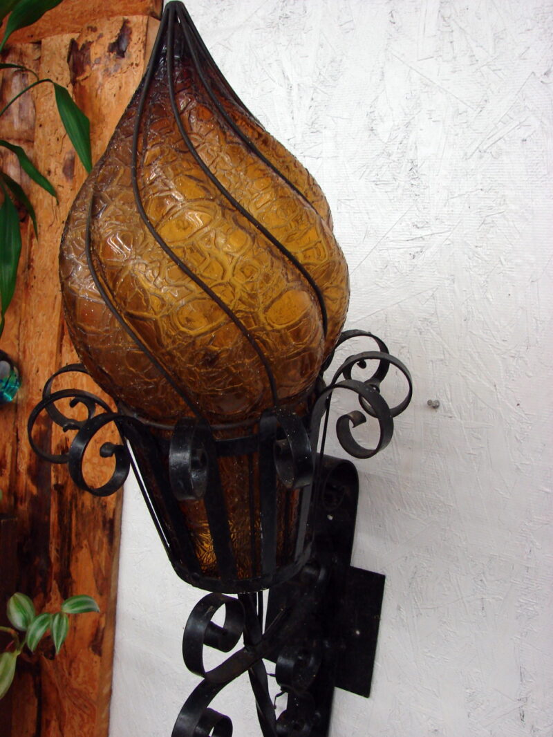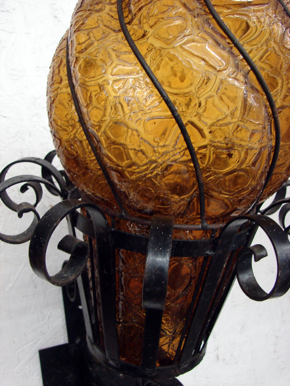 Very unique wrought iron and hand blown Craquelle crackled glass heavy duty wall sconce from Mexico. Hard wired and should work as intended. Measures a whopping 32″ tall, 12″ wide by 14″ deep. Wonderful condition for its age with no damage that we can see.