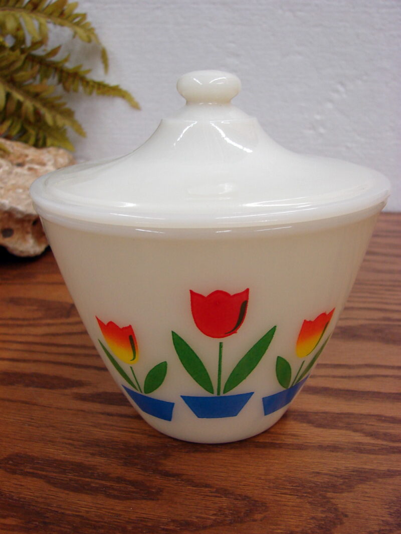 Vintage Fire King Ivory Tulip Grease Jar Oven Ware w/ Lid